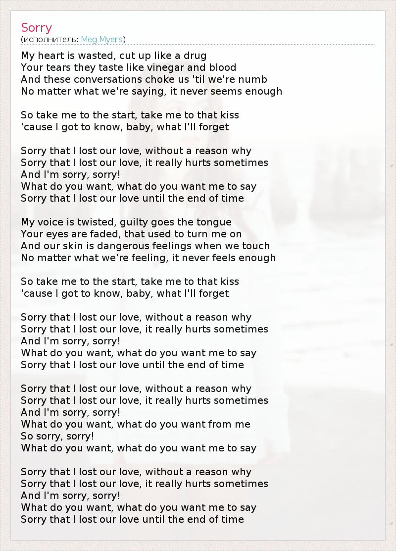My heart is wasted, cut up like a drug Your tears they taste like vinegar and blood And these conversations choke us 'til we're numb No matter what we're saying, it never seems enough So take me to the start, take me to that kiss 'cause I got to know, baby, what I'll forget Sorry that I lost our love, without a reason why Sorry that I lost our love, it really hurts sometimes And I'm sorry, sorry! What do you want, what do you want me to say Sorry that I lost our love until the end of time My voice is twisted, guilty goes the tongue Your eyes are faded, that used to turn me on And our skin is dangerous feelings when we touch No matter what we're feeling, it never feels enough So take me to the start, take me to that kiss 'cause I got to know, baby, what I'll forget Sorry that I lost our love, without a reason why Sorry that I lost our love, it really hurts sometimes And I'm sorry, sorry! What do you want, what do you want me to say Sorry that I lost our love until the end of time Sorry that I lost our love, without a reason why Sorry that I lost our love, it really hurts sometimes And I'm sorry, sorry! What do you want, what do you want from me So sorry, sorry! What do you want, what do you want me to say Sorry that I lost our love, without a reason why Sorry that I lost our love, it really hurts sometimes And I'm sorry, sorry! What do you want, what do you want me to say Sorry that I lost our love until the end of time