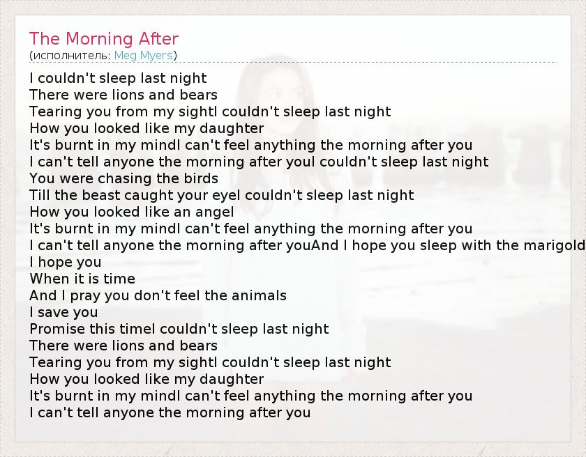I couldn't sleep last night There were lions and bears Tearing you from my sightI couldn't sleep last night How you looked like my daughter It's burnt in my mindI can't feel anything the morning after you I can't tell anyone the morning after youI couldn't sleep last night You were chasing the birds Till the beast caught your eyeI couldn't sleep last night How you looked like an angel It's burnt in my mindI can't feel anything the morning after you I can't tell anyone the morning after youAnd I hope you sleep with the marigold I hope you When it is time And I pray you don't feel the animals I save you Promise this timeI couldn't sleep last night There were lions and bears Tearing you from my sightI couldn't sleep last night How you looked like my daughter It's burnt in my mindI can't feel anything the morning after you I can't tell anyone the morning after you
