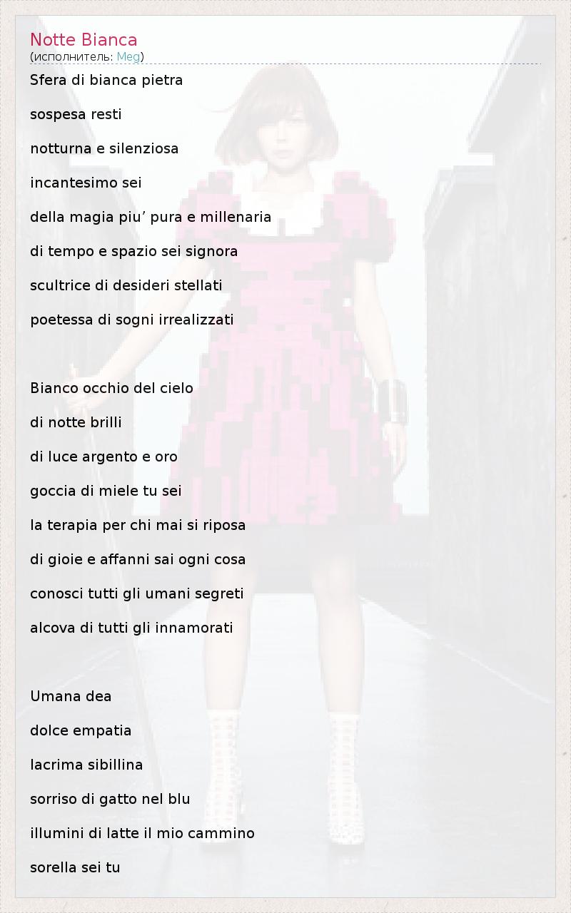 Это интересно:К сожалению, на этой странице смешали 2-х разных певиц: итальянку и японку.Итальянке принадлежат альбомы: Meg, Psychodelice, Psychodelice (iTunes version), Senza Paura.Офф.сайт: http://m-e-g.it/wp/