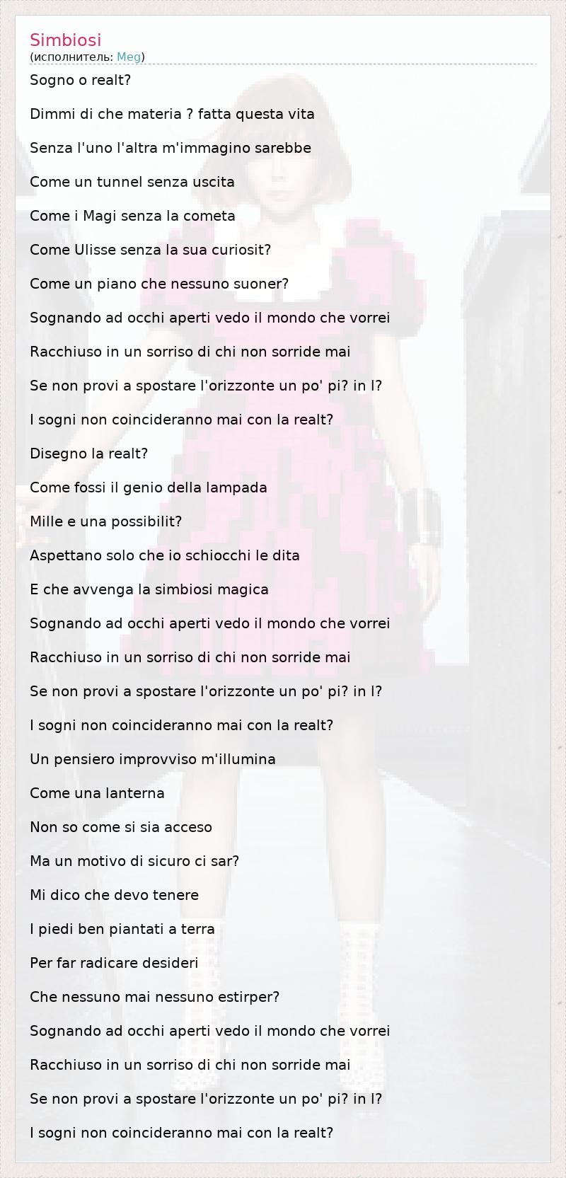 Это интересно:К сожалению, на этой странице смешали 2-х разных певиц: итальянку и японку.Итальянке принадлежат альбомы: Meg, Psychodelice, Psychodelice (iTunes version), Senza Paura.Офф.сайт: http://m-e-g.it/wp/