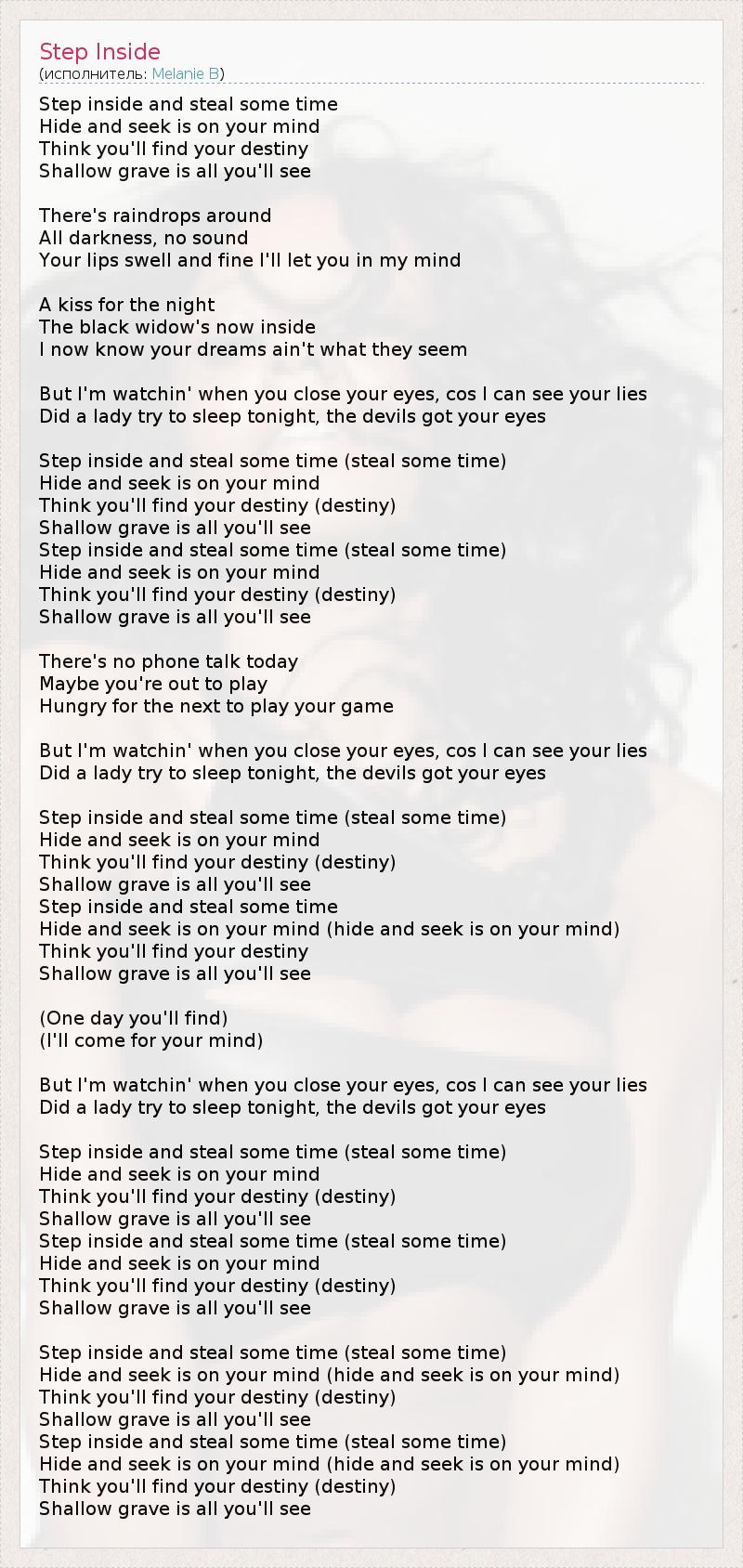 Step inside and steal some time Hide and seek is on your mind Think you'll find your destiny Shallow grave is all you'll see There's raindrops around All darkness, no sound Your lips swell and fine I'll let you in my mind A kiss for the night The black widow's now inside I now know your dreams ain't what they seem But I'm watchin' when you close your eyes, cos I can see your lies Did a lady try to sleep tonight, the devils got your eyes Step inside and steal some time (steal some time) Hide and seek is on your mind Think you'll find your destiny (destiny) Shallow grave is all you'll see Step inside and steal some time (steal some time) Hide and seek is on your mind Think you'll find your destiny (destiny) Shallow grave is all you'll see There's no phone talk today Maybe you're out to play Hungry for the next to play your game But I'm watchin' when you close your eyes, cos I can see your lies Did a lady try to sleep tonight, the devils got your eyes Step inside and steal some time (steal some time) Hide and seek is on your mind Think you'll find your destiny (destiny) Shallow grave is all you'll see Step inside and steal some time Hide and seek is on your mind (hide and seek is on your mind) Think you'll find your destiny Shallow grave is all you'll see (One day you'll find) (I'll come for your mind) But I'm watchin' when you close your eyes, cos I can see your lies Did a lady try to sleep tonight, the devils got your eyes Step inside and steal some time (steal some time) Hide and seek is on your mind Think you'll find your destiny (destiny) Shallow grave is all you'll see Step inside and steal some time (steal some time) Hide and seek is on your mind Think you'll find your destiny (destiny) Shallow grave is all you'll see Step inside and steal some time (steal some time) Hide and seek is on your mind (hide and seek is on your mind) Think you'll find your destiny (destiny) Shallow grave is all you'll see Step inside and steal some time (steal some time) Hide and seek is on your mind (hide and seek is on your mind) Think you'll find your destiny (destiny) Shallow grave is all you'll see