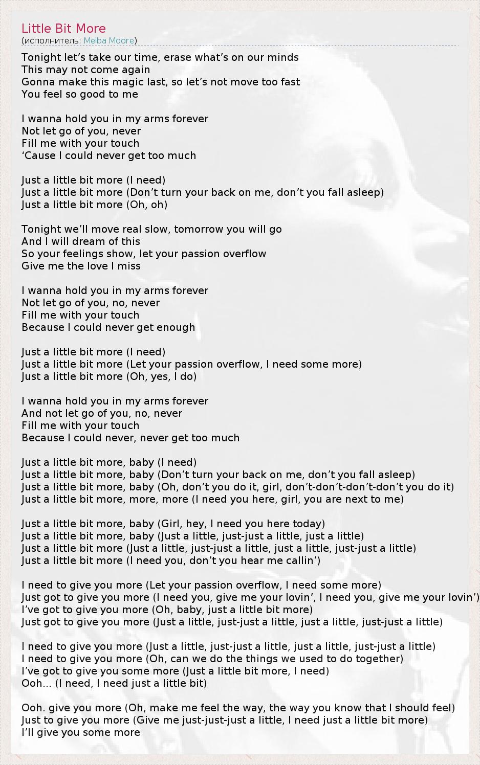 Tonight let’s take our time, erase what’s on our minds This may not come again Gonna make this magic last, so let’s not move too fast You feel so good to me I wanna hold you in my arms forever Not let go of you, never Fill me with your touch ‘Cause I could never get too much Just a little bit more (I need) Just a little bit more (Don’t turn your back on me, don’t you fall asleep) Just a little bit more (Oh, oh) Tonight we’ll move real slow, tomorrow you will go And I will dream of this So your feelings show, let your passion overflow Give me the love I miss I wanna hold you in my arms forever Not let go of you, no, never Fill me with your touch Because I could never get enough Just a little bit more (I need) Just a little bit more (Let your passion overflow, I need some more) Just a little bit more (Oh, yes, I do) I wanna hold you in my arms forever And not let go of you, no, never Fill me with your touch Because I could never, never get too much Just a little bit more, baby (I need) Just a little bit more, baby (Don’t turn your back on me, don’t you fall asleep) Just a little bit more, baby (Oh, don’t you do it, girl, don’t-don’t-don’t-don’t you do it) Just a little bit more, more, more (I need you here, girl, you are next to me) Just a little bit more, baby (Girl, hey, I need you here today) Just a little bit more, baby (Just a little, just-just a little, just a little) Just a little bit more (Just a little, just-just a little, just a little, just-just a little) Just a little bit more (I need you, don’t you hear me callin’) I need to give you more (Let your passion overflow, I need some more) Just got to give you more (I need you, give me your lovin’, I need you, give me your lovin’) I’ve got to give you more (Oh, baby, just a little bit more) Just got to give you more (Just a little, just-just a little, just a little, just-just a little) I need to give you more (Just a little, just-just a little, just a little, just-just a little) I need to give you more (Oh, can we do the things we used to do together) I’ve got to give you some more (Just a little bit more, I need) Ooh... (I need, I need just a little bit) Ooh. give you more (Oh, make me feel the way, the way you know that I should feel) Just to give you more (Give me just-just-just a little, I need just a little bit more) I’ll give you some more