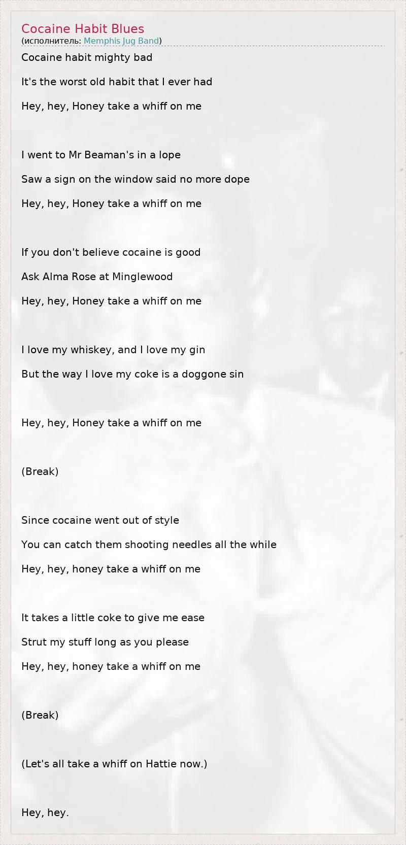Cocaine habit mighty bad It's the worst old habit that I ever had Hey, hey, Honey take a whiff on me I went to Mr Beaman's in a lope Saw a sign on the window said no more dope Hey, hey, Honey take a whiff on me If you don't believe cocaine is good Ask Alma Rose at Minglewood Hey, hey, Honey take a whiff on me I love my whiskey, and I love my gin But the way I love my coke is a doggone sin Hey, hey, Honey take a whiff on me (Break) Since cocaine went out of style You can catch them shooting needles all the while Hey, hey, honey take a whiff on me It takes a little coke to give me ease Strut my stuff long as you please Hey, hey, honey take a whiff on me (Break) (Let's all take a whiff on Hattie now.) Hey, hey.