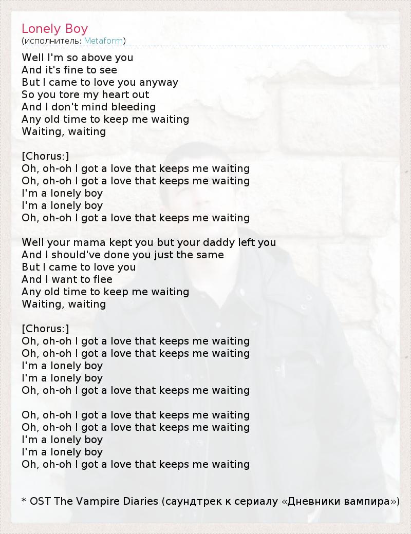 Well I'm so above you And it's fine to see But I came to love you anyway So you tore my heart out And I don't mind bleeding Any old time to keep me waiting Waiting, waiting [Chorus:] Oh, oh-oh I got a love that keeps me waiting Oh, oh-oh I got a love that keeps me waiting I'm a lonely boy I'm a lonely boy Oh, oh-oh I got a love that keeps me waiting Well your mama kept you but your daddy left you And I should've done you just the same But I came to love you And I want to flee Any old time to keep me waiting Waiting, waiting [Chorus:] Oh, oh-oh I got a love that keeps me waiting Oh, oh-oh I got a love that keeps me waiting I'm a lonely boy I'm a lonely boy Oh, oh-oh I got a love that keeps me waiting Oh, oh-oh I got a love that keeps me waiting Oh, oh-oh I got a love that keeps me waiting I'm a lonely boy I'm a lonely boy Oh, oh-oh I got a love that keeps me waiting * OST The Vampire Diaries (саундтрек к сериалу «Дневники вампира»)