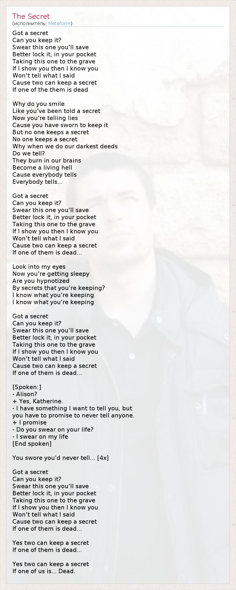 У меня есть тайна, Можешь ли ты сохранить ее? Клянись, что эту тайну ты сохранишь, Лучше спрячь ее у себя в кармане, Забери ее с собой в могилу. Если я открою её тебе, значит, я уверена, что ты Никому не расскажешь об услышанном, Потому что двое могут хранить тайну Только в том случае, если один из них мертв. Почему ты улыбаешься, Как будто с тобой поделились секретом? И теперь ты врешь, Потому что поклялась сохранить ее. Но никто не хранит тайны, Никто не хранит тайны. Почему когда мы совершаем самые плохие поступки, Мы рассказываем о них? Они прожигают нам мозг, Становятся сущим адом, Потому что все говорят, Все говорят ... У меня есть тайна, Можешь ли ты сохранить ее? Клянись, что эту тайну ты сохранишь, Лучше спрячь ее у себя в кармане, Забери ее с собой в могилу. Если я открою её тебе, значит, я уверена, что ты Никому не расскажешь об услышанном, Потому что двое могут хранить тайну Только в том случае, если один из них мертв. Посмотри в мои глаза - Ну вот - ты засыпаешь. Ты загипнотизирована Тайнами, которые пытаешься сохранить? Я знаю, что ты скрываешь, Я знаю, что ты скрываешь... У меня есть тайна, Можешь ли ты сохранить ее? Клянись, что эту тайну ты сохранишь, Лучше спрячь ее у себя в кармане, Забери ее с собой в могилу. Если я открою её тебе, значит, я уверена, что ты Никому не расскажешь об услышанном, Потому что двое могут хранить тайну Только в том случае, если один из них мертв. [Разговор:] - Элисон? + Да, Кэтрин. - У меня есть то, что я хочу тебе сказать, но Ты должна пообещать, что никому об этом не расскажешь. + Я обещаю. - Клянешься ли ты жизнью? + Клянусь жизнью. [Конец разговора] Ты поклялась, никогда никому не говорить... [4x] У меня есть тайна, Можешь ли ты сохранить ее? Клянись, что эту тайну ты сохранишь, Лучше спрячь ее у себя в кармане, Забери ее с собой в могилу. Если я открою её тебе, значит, я уверена, что ты Никому не расскажешь об услышанном, Потому что двое могут хранить тайну Только в том случае, если один из них мертв. Да, двое могут хранить тайну Только в том случае, если один из них мертв. Да, двое могут хранить тайну Только в том случае, если один из нас... Мертва.