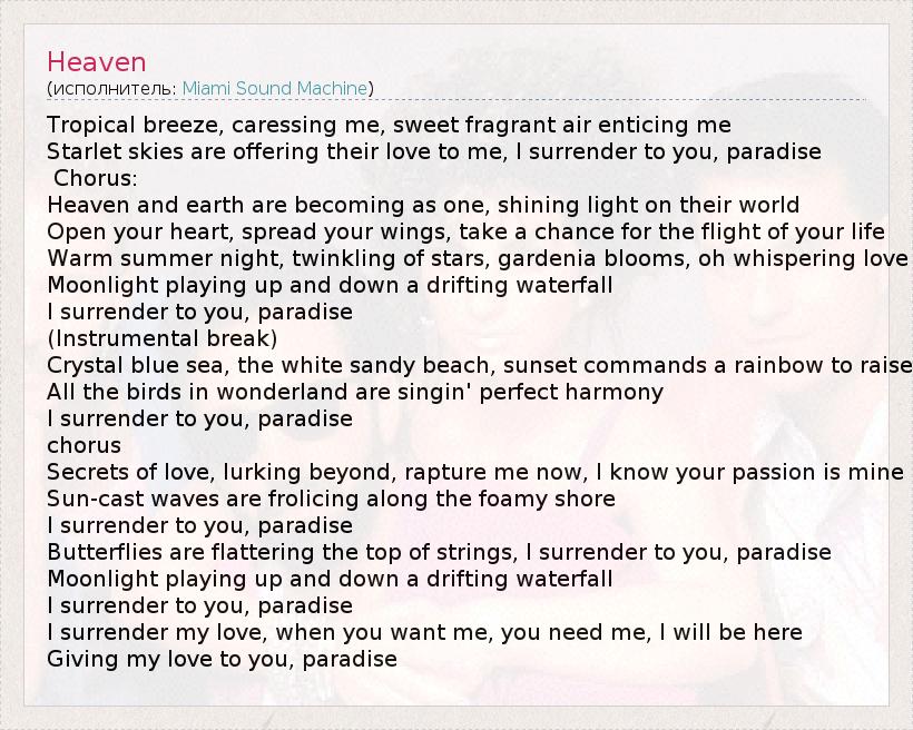 Tropical breeze, caressing me, sweet fragrant air enticing me Starlet skies are offering their love to me, I surrender to you, paradise Chorus: Heaven and earth are becoming as one, shining light on their world Open your heart, spread your wings, take a chance for the flight of your life Warm summer night, twinkling of stars, gardenia blooms, oh whispering love Moonlight playing up and down a drifting waterfall I surrender to you, paradise (Instrumental break) Crystal blue sea, the white sandy beach, sunset commands a rainbow to raise All the birds in wonderland are singin' perfect harmony I surrender to you, paradise chorus Secrets of love, lurking beyond, rapture me now, I know your passion is mine Sun-cast waves are frolicing along the foamy shore I surrender to you, paradise Butterflies are flattering the top of strings, I surrender to you, paradise Moonlight playing up and down a drifting waterfall I surrender to you, paradise I surrender my love, when you want me, you need me, I will be here Giving my love to you, paradise