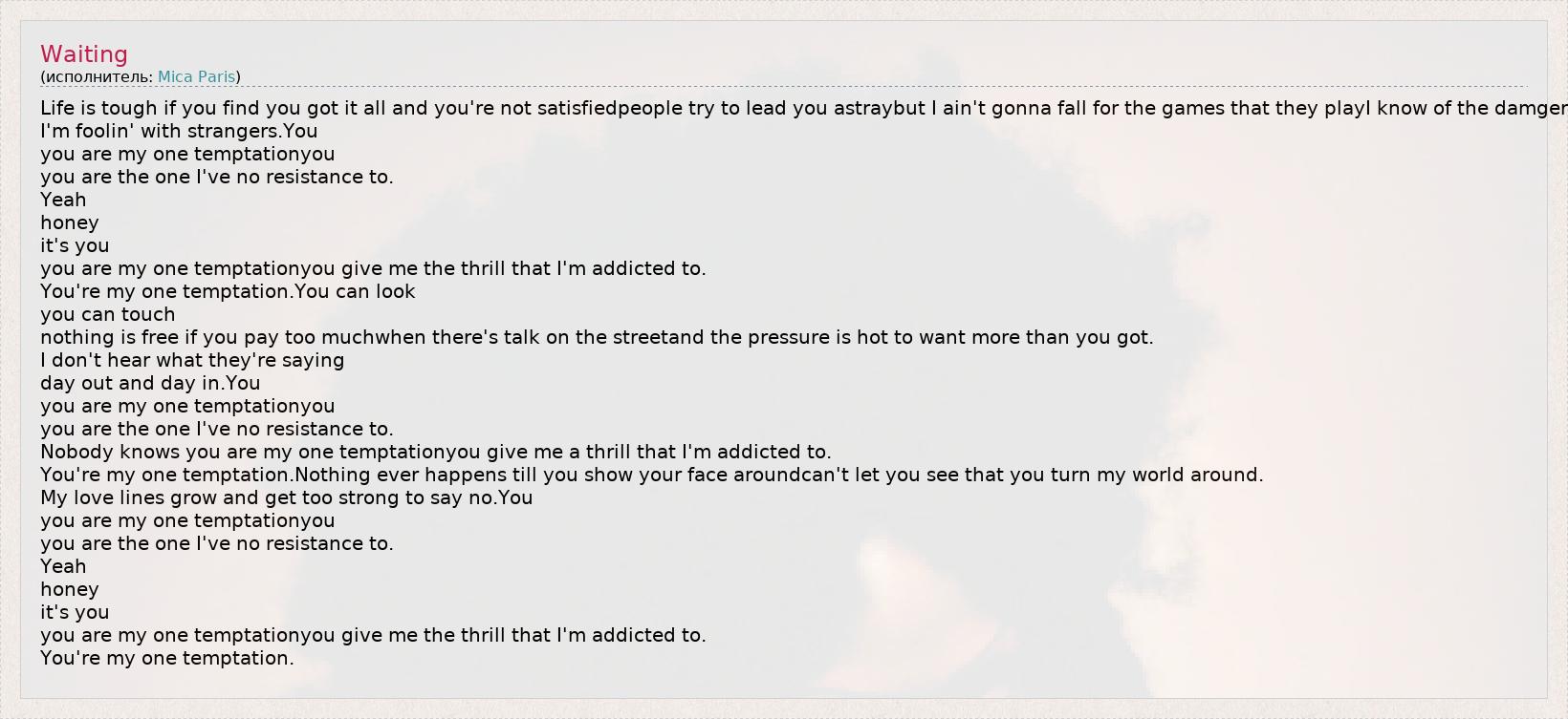 Nobody knows you are my one temptationyou give me a thrill that I'm addicted to.