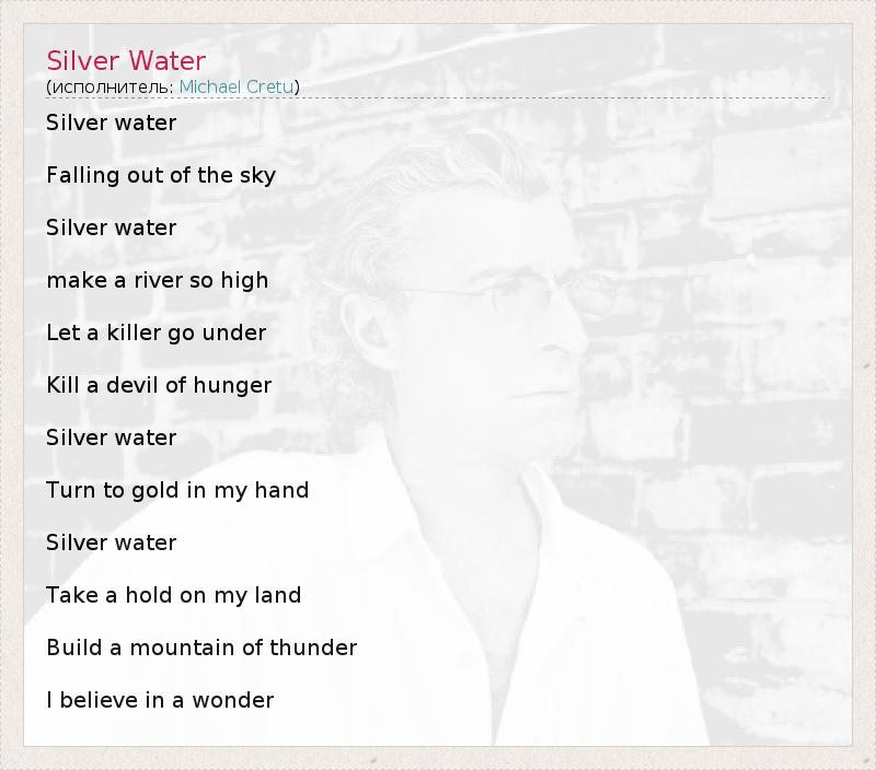 Silver water Falling out of the sky Silver water make a river so high Let a killer go under Kill a devil of hunger Silver water Turn to gold in my hand Silver water Take a hold on my land Build a mountain of thunder I believe in a wonder
