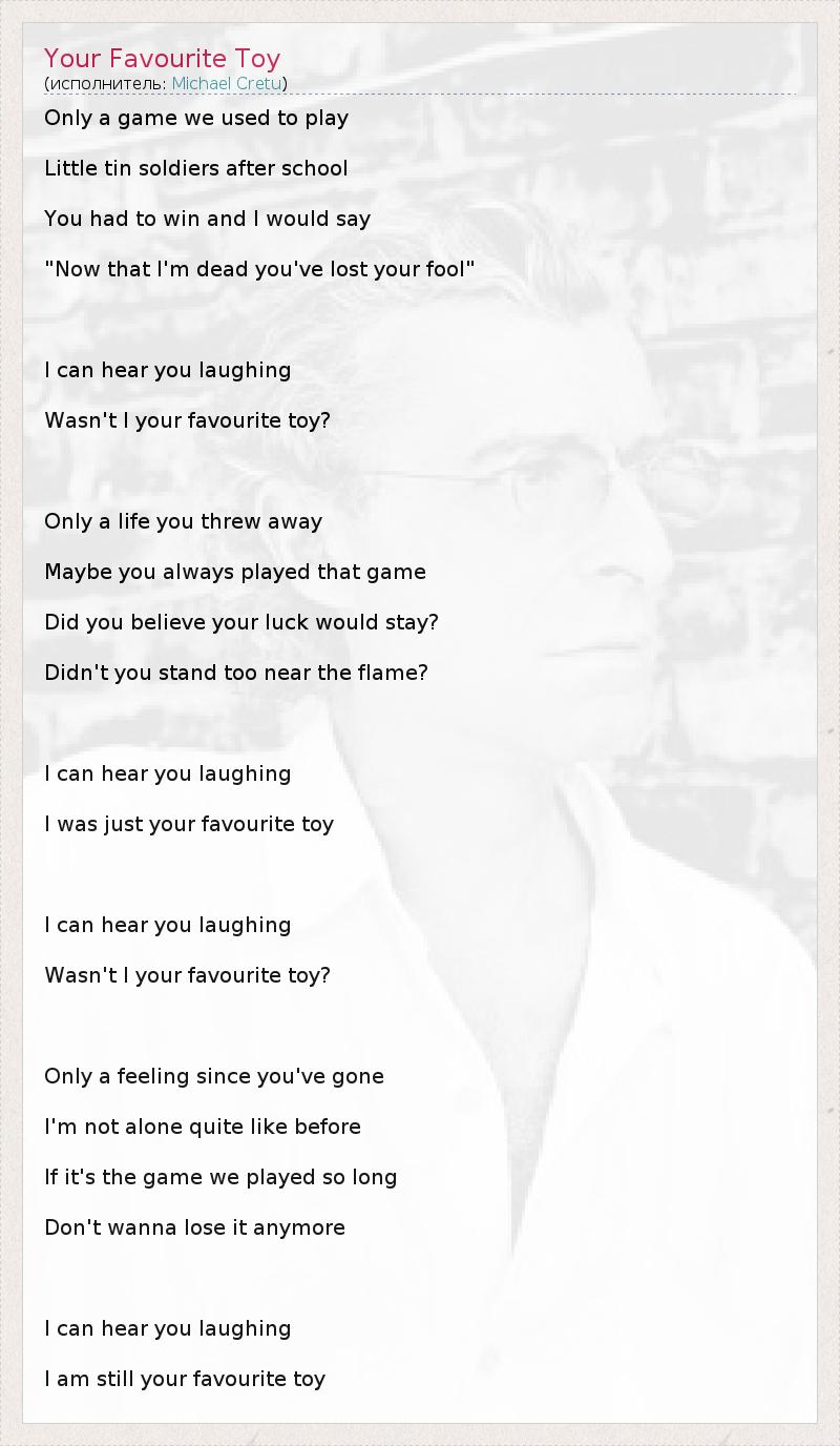 Only a game we used to play Little tin soldiers after school You had to win and I would say "Now that I'm dead you've lost your fool" I can hear you laughing Wasn't I your favourite toy? Only a life you threw away Maybe you always played that game Did you believe your luck would stay? Didn't you stand too near the flame? I can hear you laughing I was just your favourite toy I can hear you laughing Wasn't I your favourite toy? Only a feeling since you've gone I'm not alone quite like before If it's the game we played so long Don't wanna lose it anymore I can hear you laughing I am still your favourite toy