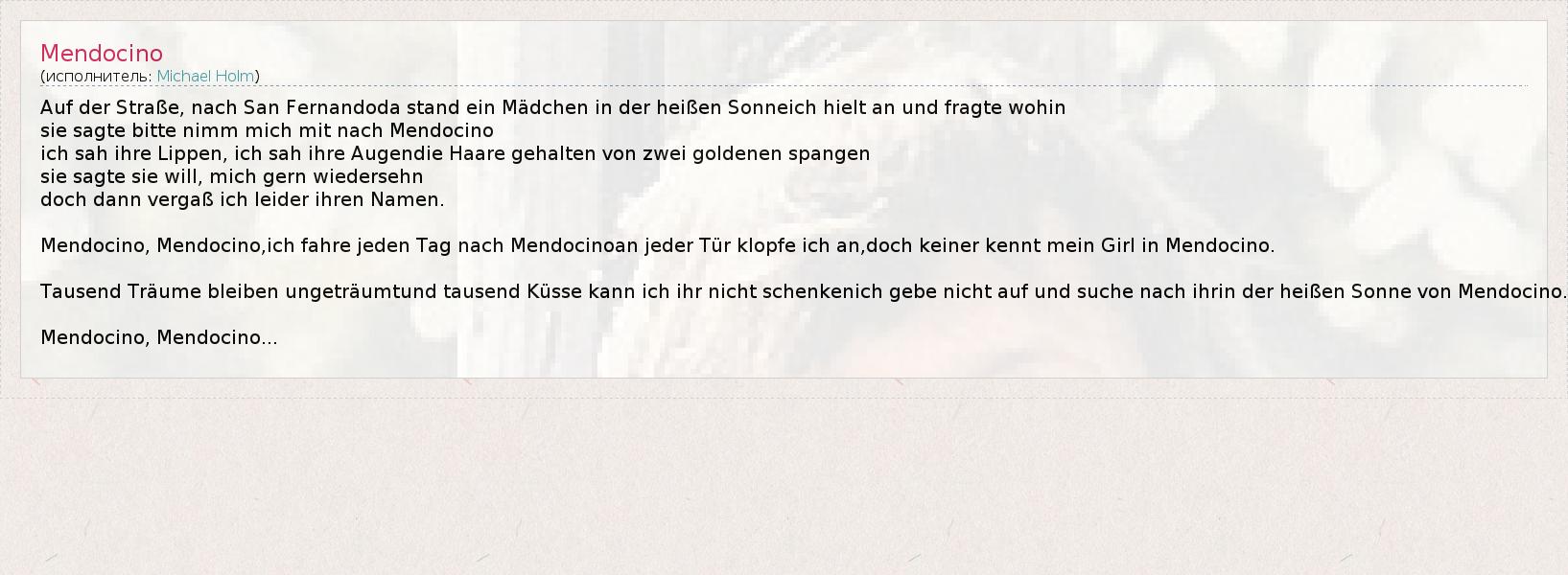 Mendocino, Mendocino,ich fahre jeden Tag nach Mendocinoan jeder Tür klopfe ich an,doch keiner kennt mein Girl in Mendocino.