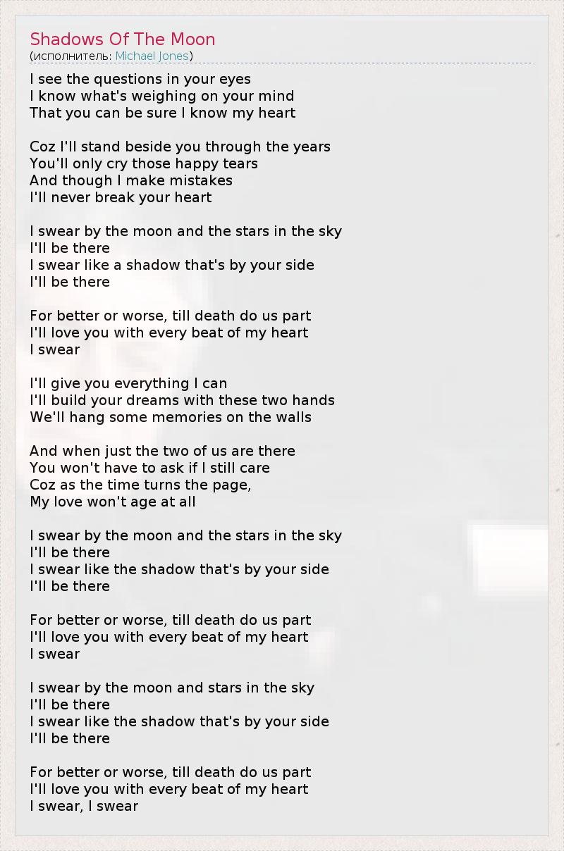 В твоих глазах отражаются вопросы - Я знаю, что тебя терзает. Но можешь быть уверена – я знаю свое сердце! Потому, что я буду с тобой много, много лет, И плакать ты будешь только от счастья. Хотя я допускаю ошибки, Я никогда не разобью твое сердце. Я клянусь луной и звездами в небе, Что буду с тобой. Я клянусь всегда следовать за тобой, как тень, Я буду с тобой... В горе и радости, пока смерть не разлучит нас, Я буду любить тебя с каждым ударом моего сердца, Я клянусь... Я дам тебе все, что могу, Я воплощу твои мечты в реальность этими руками. Мы украсим стены фотографиями на память. И когда мы останемся только вдвоем, Ты не будешь спрашивать – люблю ли я тебя по-прежнему, Потому, что время листает страницы, Но моя любовь к тебе никогда не постареет. Я клянусь луной и звездами в небе, Что буду с тобой. Я клянусь всегда следовать за тобой, как тень, Я буду с тобой... В горе и радости, пока смерть не разлучит нас, Я буду любить тебя с каждым ударом моего сердца, Я клянусь... Я клянусь луной и звездами в небе, Что буду с тобой. Я клянусь всегда следовать за тобой, как тень, Я буду с тобой... В горе и радости, пока смерть не разлучит нас, Я буду любить тебя с каждым ударом моего сердца, Я клянусь...