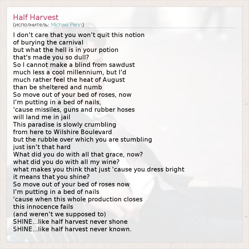 I don't care that you won't quit this notion of burying the carnival but what the hell is in your potion that's made you so dull? So I cannot make a blind from sawdust much less a cool millennium, but I'd much rather feel the heat of August than be sheltered and numb So move out of your bed of roses, now I'm putting in a bed of nails, 'cause missiles, guns and rubber hoses will land me in jail This paradise is slowly crumbling from here to Wilshire Boulevard but the rubble over which you are stumbling just isn't that hard What did you do with all that grace, now? what did you do with all my wine? what makes you think that just 'cause you dress bright it means that you shine? So move out of your bed of roses now I'm putting in a bed of nails 'cause when this whole production closes this innocence fails (and weren't we supposed to) SHINE...like half harvest never shone SHINE...like half harvest never known.