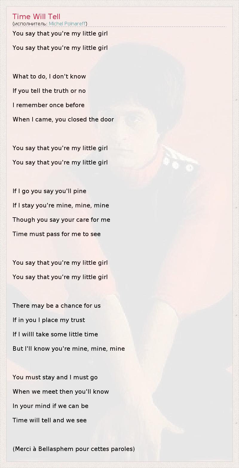 You say that you're my little girl You say that you're my little girl What to do, I don't know If you tell the truth or no I remember once before When I came, you closed the door You say that you're my little girl You say that you're my little girl If I go you say you'll pine If I stay you're mine, mine, mine Though you say your care for me Time must pass for me to see You say that you're my little girl You say that you're my little girl There may be a chance for us If in you I place my trust If I willl take some little time But I'll know you're mine, mine, mine You must stay and I must go When we meet then you'll know In your mind if we can be Time will tell and we see (Merci à Bellasphem pour cettes paroles)
