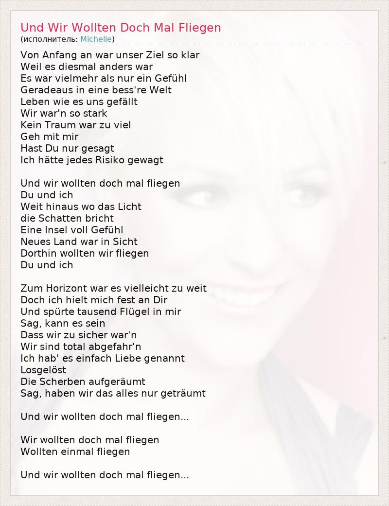 Von Anfang an war unser Ziel so klar Weil es diesmal anders war Es war vielmehr als nur ein Gefühl Geradeaus in eine bess're Welt Leben wie es uns gefällt Wir war'n so stark Kein Traum war zu viel Geh mit mir Hast Du nur gesagt Ich hätte jedes Risiko gewagt Und wir wollten doch mal fliegen Du und ich Weit hinaus wo das Licht die Schatten bricht Eine Insel voll Gefühl Neues Land war in Sicht Dorthin wollten wir fliegen Du und ich Zum Horizont war es vielleicht zu weit Doch ich hielt mich fest an Dir Und spürte tausend Flügel in mir Sag, kann es sein Dass wir zu sicher war'n Wir sind total abgefahr'n Ich hab' es einfach Liebe genannt Losgelöst Die Scherben aufgeräumt Sag, haben wir das alles nur geträumt Und wir wollten doch mal fliegen... Wir wollten doch mal fliegen Wollten einmal fliegen Und wir wollten doch mal fliegen...