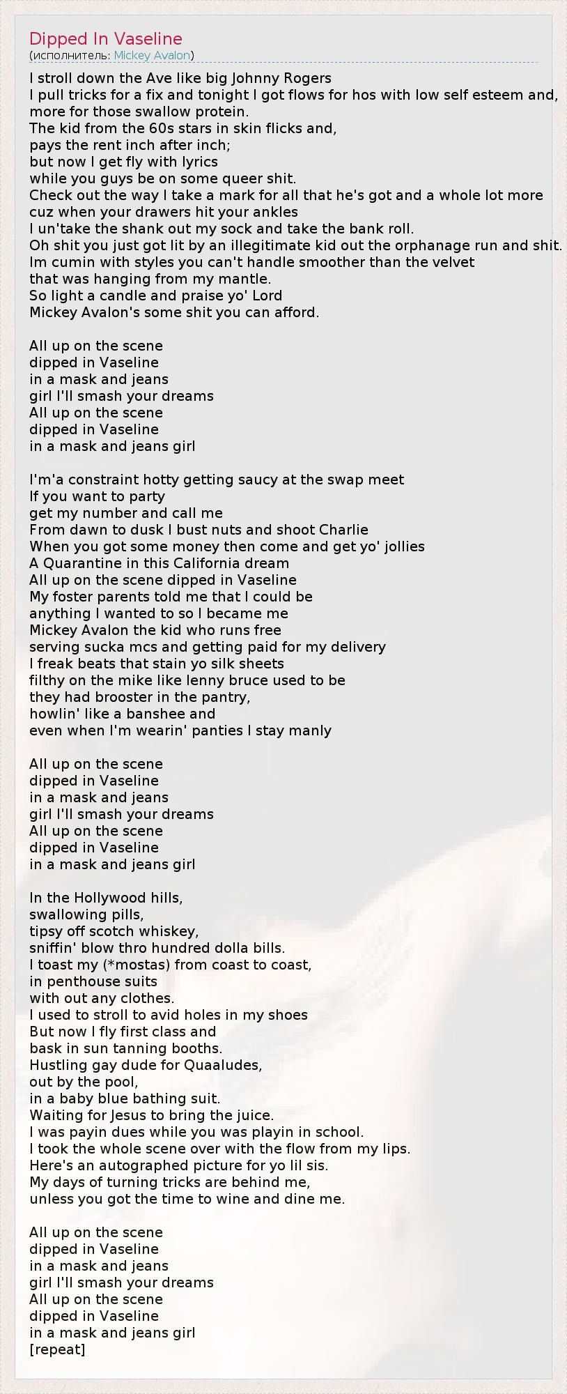 I stroll down the Ave like big Johnny Rogers I pull tricks for a fix and tonight I got flows for hos with low self esteem and, more for those swallow protein. The kid from the 60s stars in skin flicks and, pays the rent inch after inch; but now I get fly with lyrics while you guys be on some queer shit. Check out the way I take a mark for all that he's got and a whole lot more cuz when your drawers hit your ankles I un'take the shank out my sock and take the bank roll. Oh shit you just got lit by an illegitimate kid out the orphanage run and shit. Im cumin with styles you can't handle smoother than the velvet that was hanging from my mantle. So light a candle and praise yo' Lord Mickey Avalon's some shit you can afford. All up on the scene dipped in Vaseline in a mask and jeans girl I'll smash your dreams All up on the scene dipped in Vaseline in a mask and jeans girl I'm'a constraint hotty getting saucy at the swap meet If you want to party get my number and call me From dawn to dusk I bust nuts and shoot Charlie When you got some money then come and get yo' jollies A Quarantine in this California dream All up on the scene dipped in Vaseline My foster parents told me that I could be anything I wanted to so I became me Mickey Avalon the kid who runs free serving sucka mcs and getting paid for my delivery I freak beats that stain yo silk sheets filthy on the mike like lenny bruce used to be they had brooster in the pantry, howlin' like a banshee and even when I'm wearin' panties I stay manly All up on the scene dipped in Vaseline in a mask and jeans girl I'll smash your dreams All up on the scene dipped in Vaseline in a mask and jeans girl In the Hollywood hills, swallowing pills, tipsy off scotch whiskey, sniffin' blow thro hundred dolla bills. I toast my (*mostas) from coast to coast, in penthouse suits with out any clothes. I used to stroll to avid holes in my shoes But now I fly first class and bask in sun tanning booths. Hustling gay dude for Quaaludes, out by the pool, in a baby blue bathing suit. Waiting for Jesus to bring the juice. I was payin dues while you was playin in school. I took the whole scene over with the flow from my lips. Here's an autographed picture for yo lil sis. My days of turning tricks are behind me, unless you got the time to wine and dine me. All up on the scene dipped in Vaseline in a mask and jeans girl I'll smash your dreams All up on the scene dipped in Vaseline in a mask and jeans girl [repeat]
