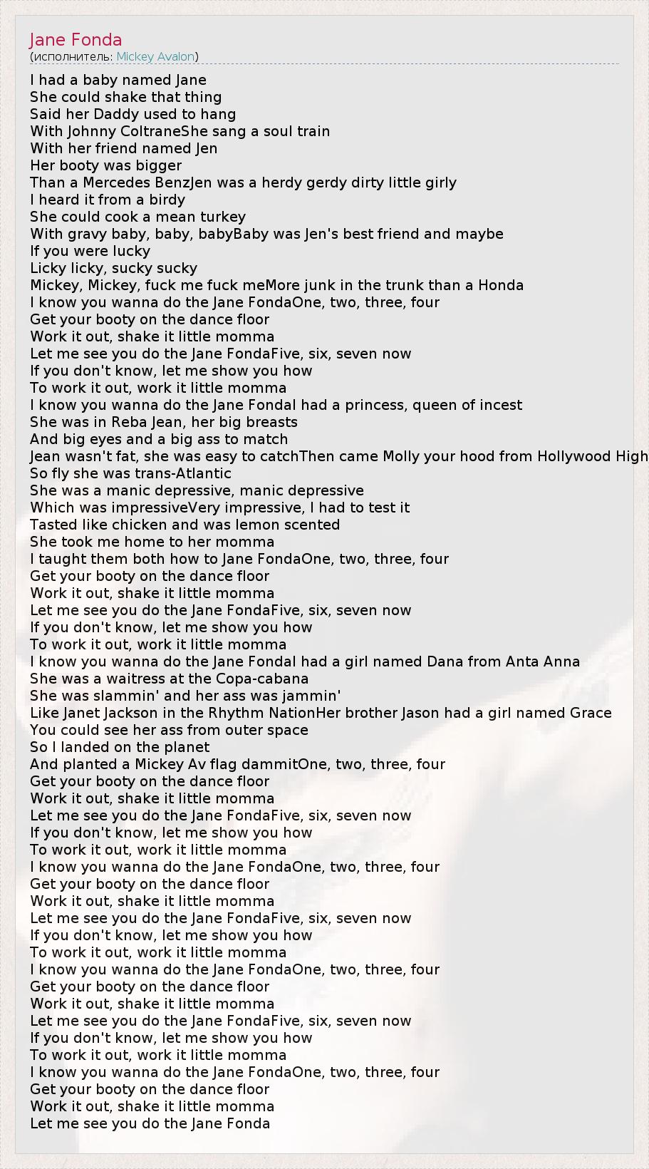 I had a baby named Jane She could shake that thing Said her Daddy used to hang With Johnny ColtraneShe sang a soul train With her friend named Jen Her booty was bigger Than a Mercedes BenzJen was a herdy gerdy dirty little girly I heard it from a birdy She could cook a mean turkey With gravy baby, baby, babyBaby was Jen's best friend and maybe If you were lucky Licky licky, sucky sucky Mickey, Mickey, fuck me fuck meMore junk in the trunk than a Honda I know you wanna do the Jane FondaOne, two, three, four Get your booty on the dance floor Work it out, shake it little momma Let me see you do the Jane FondaFive, six, seven now If you don't know, let me show you how To work it out, work it little momma I know you wanna do the Jane FondaI had a princess, queen of incest She was in Reba Jean, her big breasts And big eyes and a big ass to match Jean wasn't fat, she was easy to catchThen came Molly your hood from Hollywood High So fly she was trans-Atlantic She was a manic depressive, manic depressive Which was impressiveVery impressive, I had to test it Tasted like chicken and was lemon scented She took me home to her momma I taught them both how to Jane FondaOne, two, three, four Get your booty on the dance floor Work it out, shake it little momma Let me see you do the Jane FondaFive, six, seven now If you don't know, let me show you how To work it out, work it little momma I know you wanna do the Jane FondaI had a girl named Dana from Anta Anna She was a waitress at the Copa-cabana She was slammin' and her ass was jammin' Like Janet Jackson in the Rhythm NationHer brother Jason had a girl named Grace You could see her ass from outer space So I landed on the planet And planted a Mickey Av flag dammitOne, two, three, four Get your booty on the dance floor Work it out, shake it little momma Let me see you do the Jane FondaFive, six, seven now If you don't know, let me show you how To work it out, work it little momma I know you wanna do the Jane FondaOne, two, three, four Get your booty on the dance floor Work it out, shake it little momma Let me see you do the Jane FondaFive, six, seven now If you don't know, let me show you how To work it out, work it little momma I know you wanna do the Jane FondaOne, two, three, four Get your booty on the dance floor Work it out, shake it little momma Let me see you do the Jane FondaFive, six, seven now If you don't know, let me show you how To work it out, work it little momma I know you wanna do the Jane FondaOne, two, three, four Get your booty on the dance floor Work it out, shake it little momma Let me see you do the Jane Fonda