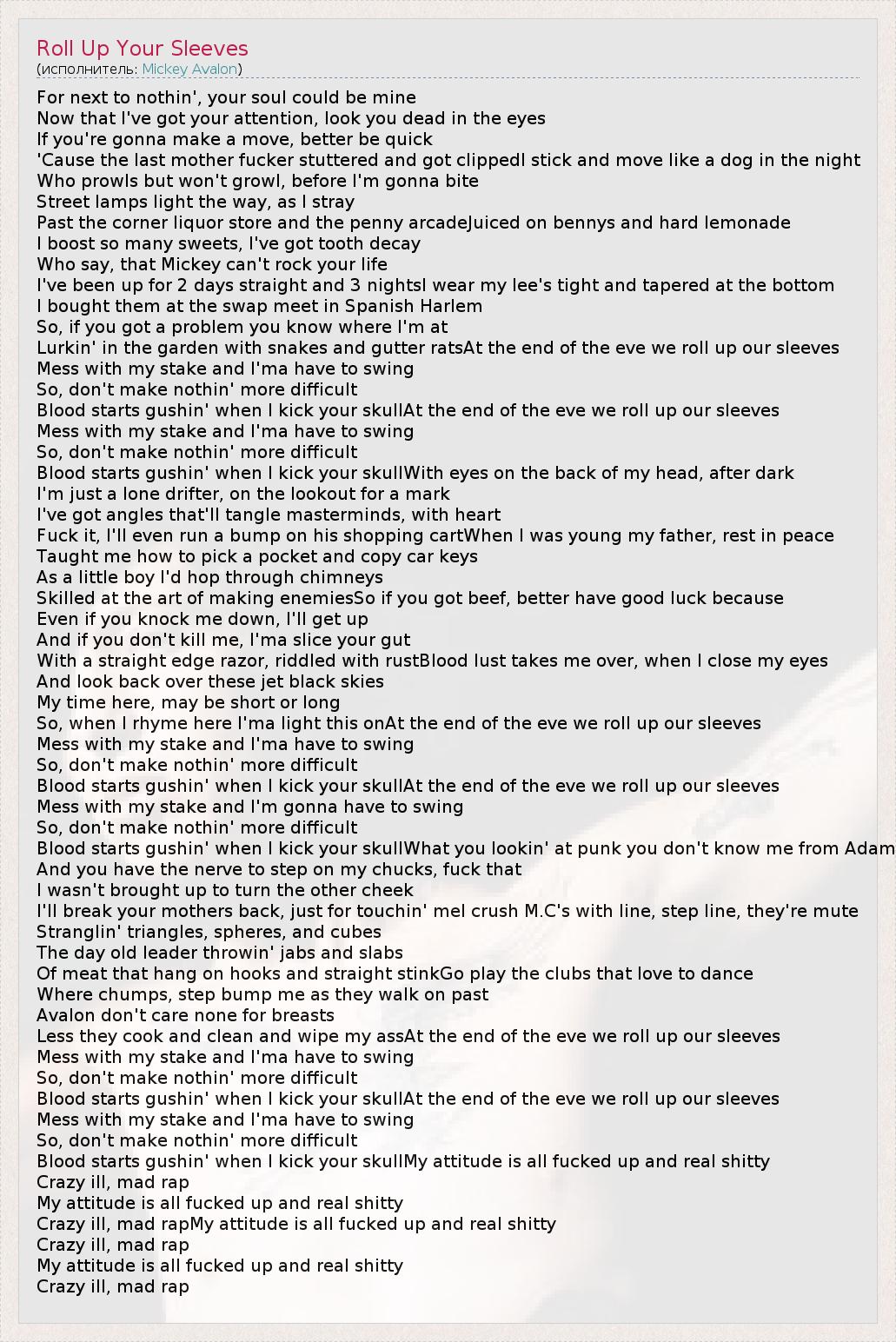For next to nothin', your soul could be mine Now that I've got your attention, look you dead in the eyes If you're gonna make a move, better be quick 'Cause the last mother fucker stuttered and got clippedI stick and move like a dog in the night Who prowls but won't growl, before I'm gonna bite Street lamps light the way, as I stray Past the corner liquor store and the penny arcadeJuiced on bennys and hard lemonade I boost so many sweets, I've got tooth decay Who say, that Mickey can't rock your life I've been up for 2 days straight and 3 nightsI wear my lee's tight and tapered at the bottom I bought them at the swap meet in Spanish Harlem So, if you got a problem you know where I'm at Lurkin' in the garden with snakes and gutter ratsAt the end of the eve we roll up our sleeves Mess with my stake and I'ma have to swing So, don't make nothin' more difficult Blood starts gushin' when I kick your skullAt the end of the eve we roll up our sleeves Mess with my stake and I'ma have to swing So, don't make nothin' more difficult Blood starts gushin' when I kick your skullWith eyes on the back of my head, after dark I'm just a lone drifter, on the lookout for a mark I've got angles that'll tangle masterminds, with heart Fuck it, I'll even run a bump on his shopping cartWhen I was young my father, rest in peace Taught me how to pick a pocket and copy car keys As a little boy I'd hop through chimneys Skilled at the art of making enemiesSo if you got beef, better have good luck because Even if you knock me down, I'll get up And if you don't kill me, I'ma slice your gut With a straight edge razor, riddled with rustBlood lust takes me over, when I close my eyes And look back over these jet black skies My time here, may be short or long So, when I rhyme here I'ma light this onAt the end of the eve we roll up our sleeves Mess with my stake and I'ma have to swing So, don't make nothin' more difficult Blood starts gushin' when I kick your skullAt the end of the eve we roll up our sleeves Mess with my stake and I'm gonna have to swing So, don't make nothin' more difficult Blood starts gushin' when I kick your skullWhat you lookin' at punk you don't know me from Adam And you have the nerve to step on my chucks, fuck that I wasn't brought up to turn the other cheek I'll break your mothers back, just for touchin' meI crush M.C's with line, step line, they're mute Stranglin' triangles, spheres, and cubes The day old leader throwin' jabs and slabs Of meat that hang on hooks and straight stinkGo play the clubs that love to dance Where chumps, step bump me as they walk on past Avalon don't care none for breasts Less they cook and clean and wipe my assAt the end of the eve we roll up our sleeves Mess with my stake and I'ma have to swing So, don't make nothin' more difficult Blood starts gushin' when I kick your skullAt the end of the eve we roll up our sleeves Mess with my stake and I'ma have to swing So, don't make nothin' more difficult Blood starts gushin' when I kick your skullMy attitude is all fucked up and real shitty Crazy ill, mad rap My attitude is all fucked up and real shitty Crazy ill, mad rapMy attitude is all fucked up and real shitty Crazy ill, mad rap My attitude is all fucked up and real shitty Crazy ill, mad rap