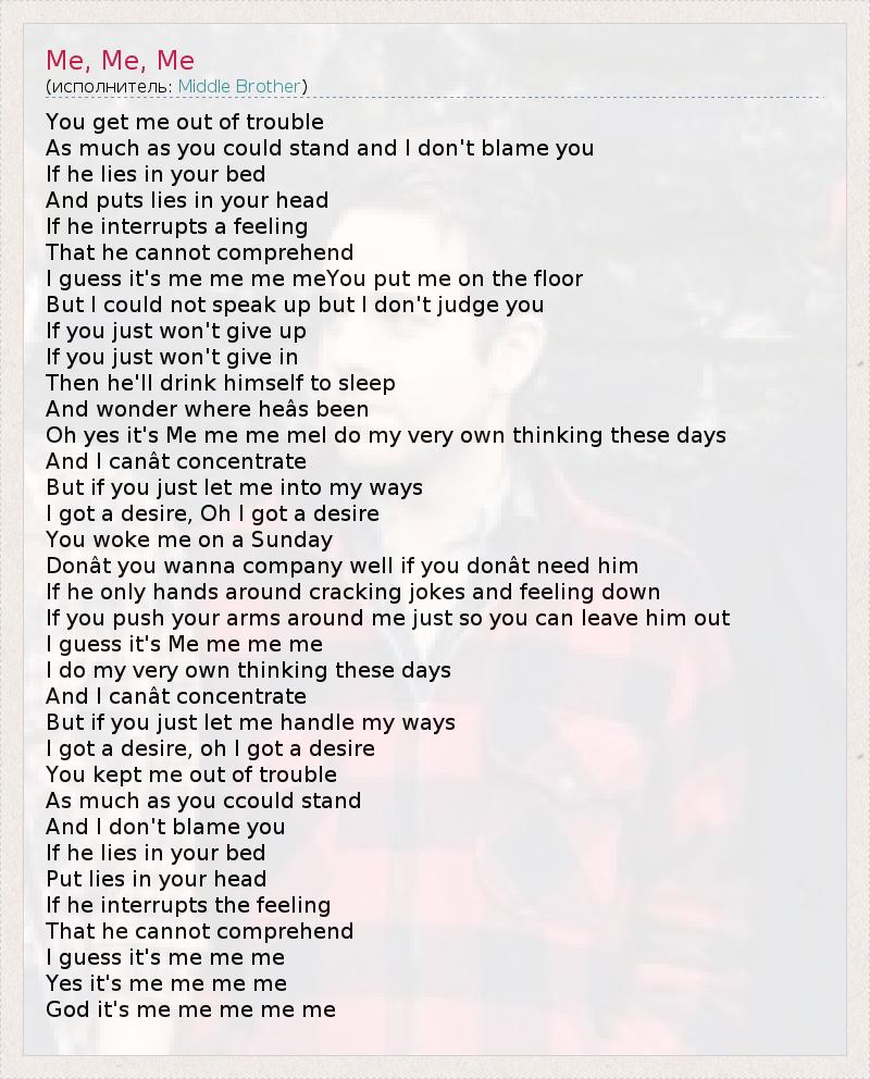 You get me out of trouble As much as you could stand and I don't blame you If he lies in your bed And puts lies in your head If he interrupts a feeling That he cannot comprehend I guess it's me me me meYou put me on the floor But I could not speak up but I don't judge you If you just won't give up If you just won't give in Then he'll drink himself to sleep And wonder where heâs been Oh yes it's Me me me meI do my very own thinking these days And I canât concentrate But if you just let me into my ways I got a desire, Oh I got a desire You woke me on a Sunday Donât you wanna company well if you donât need him If he only hands around cracking jokes and feeling down If you push your arms around me just so you can leave him out I guess it's Me me me me I do my very own thinking these days And I canât concentrate But if you just let me handle my ways I got a desire, oh I got a desire You kept me out of trouble As much as you ccould stand And I don't blame you If he lies in your bed Put lies in your head If he interrupts the feeling That he cannot comprehend I guess it's me me me Yes it's me me me me God it's me me me me me
