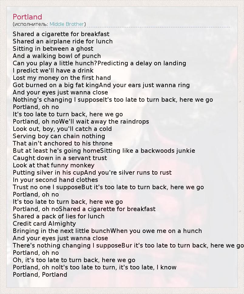 Shared a cigarette for breakfast Shared an airplane ride for lunch Sitting in between a ghost And a walking bowl of punch Can you play a little hunch?Predicting a delay on landing I predict we'll have a drink Lost my money on the first hand Got burned on a big fat kingAnd your ears just wanna ring And your eyes just wanna close Nothing's changing I supposeIt's too late to turn back, here we go Portland, oh no It's too late to turn back, here we go Portland, oh noWe'll wait away the raindrops Look out, boy, you'll catch a cold Serving boy can chain nothing That ain't anchored to his throne But at least he's going homeSitting like a backwoods junkie Caught down in a servant trust Look at that funny monkey Putting silver in his cupAnd you're silver runs to rust In your second hand clothes Trust no one I supposeBut it's too late to turn back, here we go Portland, oh no It's too late to turn back, here we go Portland, oh noShared a cigarette for breakfast Shared a pack of lies for lunch Credit card Almighty Bringing in the next little bunchWhen you owe me on a hunch And your eyes just wanna close There's nothing changing I supposeBur it's too late to turn back, here we go Portland, oh no Oh, it's too late to turn back, here we go Portland, oh noIt's too late to turn, it's too late, I know Portland, Portland