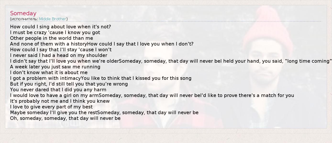 How could I sing about love when it's not? I must be crazy 'cause I know you got Other people in the world than me And none of them with a historyHow could I say that I love you when I don't? How could I say that I'll stay 'cause I won't I never said I had a head on my shoulder I didn't say that I'll love you when we're olderSomeday, someday, that day will never beI held your hand, you said, "long time coming" A week later you just saw me running I don't know what it is about me I got a problem with intimacyYou like to think that I kissed you for this song But if you right, I'd still tell you that you're wrong You never dared that I did you any harm I would love to have a girl on my armSomeday, someday, that day will never beI'd like to prove there's a match for you It's probably not me and I think you knew I love to give every part of my best Maybe someday I'll give you the restSomeday, someday, that day will never be Oh, someday, someday, that day will never be