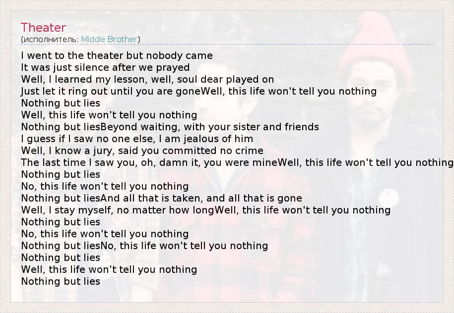 I went to the theater but nobody came It was just silence after we prayed Well, I learned my lesson, well, soul dear played on Just let it ring out until you are goneWell, this life won't tell you nothing Nothing but lies Well, this life won't tell you nothing Nothing but liesBeyond waiting, with your sister and friends I guess if I saw no one else, I am jealous of him Well, I know a jury, said you committed no crime The last time I saw you, oh, damn it, you were mineWell, this life won't tell you nothing Nothing but lies No, this life won't tell you nothing Nothing but liesAnd all that is taken, and all that is gone Well, I stay myself, no matter how longWell, this life won't tell you nothing Nothing but lies No, this life won't tell you nothing Nothing but liesNo, this life won't tell you nothing Nothing but lies Well, this life won't tell you nothing Nothing but lies