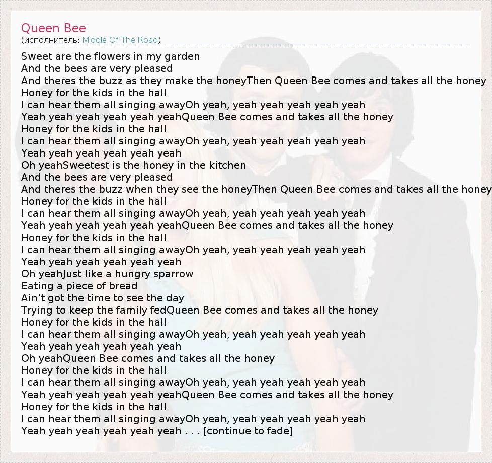 Sweet are the flowers in my garden And the bees are very pleased And theres the buzz as they make the honeyThen Queen Bee comes and takes all the honey Honey for the kids in the hall I can hear them all singing awayOh yeah, yeah yeah yeah yeah yeah Yeah yeah yeah yeah yeah yeahQueen Bee comes and takes all the honey Honey for the kids in the hall I can hear them all singing awayOh yeah, yeah yeah yeah yeah yeah Yeah yeah yeah yeah yeah yeah Oh yeahSweetest is the honey in the kitchen And the bees are very pleased And theres the buzz when they see the honeyThen Queen Bee comes and takes all the honey Honey for the kids in the hall I can hear them all singing awayOh yeah, yeah yeah yeah yeah yeah Yeah yeah yeah yeah yeah yeahQueen Bee comes and takes all the honey Honey for the kids in the hall I can hear them all singing awayOh yeah, yeah yeah yeah yeah yeah Yeah yeah yeah yeah yeah yeah Oh yeahJust like a hungry sparrow Eating a piece of bread Ain't got the time to see the day Trying to keep the family fedQueen Bee comes and takes all the honey Honey for the kids in the hall I can hear them all singing awayOh yeah, yeah yeah yeah yeah yeah Yeah yeah yeah yeah yeah yeah Oh yeahQueen Bee comes and takes all the honey Honey for the kids in the hall I can hear them all singing awayOh yeah, yeah yeah yeah yeah yeah Yeah yeah yeah yeah yeah yeahQueen Bee comes and takes all the honey Honey for the kids in the hall I can hear them all singing awayOh yeah, yeah yeah yeah yeah yeah Yeah yeah yeah yeah yeah yeah . . . [continue to fade]