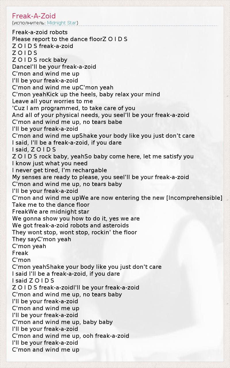Freak-a-zoid robots Please report to the dance floorZ O I D S Z O I D S freak-a-zoid Z O I D S Z O I D S rock baby DanceI'll be your freak-a-zoid C'mon and wind me up I'll be your freak-a-zoid C'mon and wind me upC'mon yeah C'mon yeahKick up the heels, baby relax your mind Leave all your worries to me 'Cuz I am programmed, to take care of you And all of your physical needs, you seeI'll be your freak-a-zoid C'mon and wind me up, no tears babe I'll be your freak-a-zoid C'mon and wind me upShake your body like you just don't care I said, I'll be a freak-a-zoid, if you dare I said, Z O I D S Z O I D S rock baby, yeahSo baby come here, let me satisfy you I know just what you need I never get tired, I'm rechargable My senses are ready to please, you seeI'll be your freak-a-zoid C'mon and wind me up, no tears baby I'll be your freak-a-zoid C'mon and wind me upWe are now entering the new [Incomprehensible] Take me to the dance floor FreakWe are midnight star We gonna show you how to do it, yes we are We got freak-a-zoid robots and asteroids They wont stop, wont stop, rockin' the floor They sayC'mon yeah C'mon yeah Freak C'mon C'mon yeahShake your body like you just don't care I said I'll be a freak-a-zoid, if you dare I said Z O I D S Z O I D S freak-a-zoidI'll be your freak-a-zoid C'mon and wind me up, no tears baby I'll be your freak-a-zoid C'mon and wind me up I'll be your freak-a-zoid C'mon and wind me up, baby baby I'll be your freak-a-zoid C'mon and wind me up, ooh freak-a-zoid I'll be your freak-a-zoid C'mon and wind me up