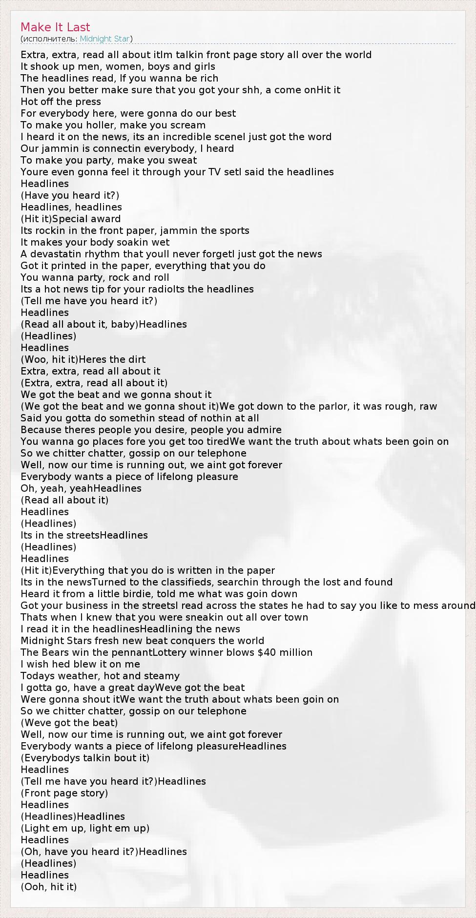Extra, extra, read all about itIm talkin front page story all over the world It shook up men, women, boys and girls The headlines read, If you wanna be rich Then you better make sure that you got your shh, a come onHit it Hot off the press For everybody here, were gonna do our best To make you holler, make you scream I heard it on the news, its an incredible sceneI just got the word Our jammin is connectin everybody, I heard To make you party, make you sweat Youre even gonna feel it through your TV setI said the headlines Headlines (Have you heard it?) Headlines, headlines (Hit it)Special award Its rockin in the front paper, jammin the sports It makes your body soakin wet A devastatin rhythm that youll never forgetI just got the news Got it printed in the paper, everything that you do You wanna party, rock and roll Its a hot news tip for your radioIts the headlines (Tell me have you heard it?) Headlines (Read all about it, baby)Headlines (Headlines) Headlines (Woo, hit it)Heres the dirt Extra, extra, read all about it (Extra, extra, read all about it) We got the beat and we gonna shout it (We got the beat and we gonna shout it)We got down to the parlor, it was rough, raw Said you gotta do somethin stead of nothin at all Because theres people you desire, people you admire You wanna go places fore you get too tiredWe want the truth about whats been goin on So we chitter chatter, gossip on our telephone Well, now our time is running out, we aint got forever Everybody wants a piece of lifelong pleasure Oh, yeah, yeahHeadlines (Read all about it) Headlines (Headlines) Its in the streetsHeadlines (Headlines) Headlines (Hit it)Everything that you do is written in the paper Its in the newsTurned to the classifieds, searchin through the lost and found Heard it from a little birdie, told me what was goin down Got your business in the streetsI read across the states he had to say you like to mess around Thats when I knew that you were sneakin out all over town I read it in the headlinesHeadlining the news Midnight Stars fresh new beat conquers the world The Bears win the pennantLottery winner blows $40 million I wish hed blew it on me Todays weather, hot and steamy I gotta go, have a great dayWeve got the beat Were gonna shout itWe want the truth about whats been goin on So we chitter chatter, gossip on our telephone (Weve got the beat) Well, now our time is running out, we aint got forever Everybody wants a piece of lifelong pleasureHeadlines (Everybodys talkin bout it) Headlines (Tell me have you heard it?)Headlines (Front page story) Headlines (Headlines)Headlines (Light em up, light em up) Headlines (Oh, have you heard it?)Headlines (Headlines) Headlines (Ooh, hit it)