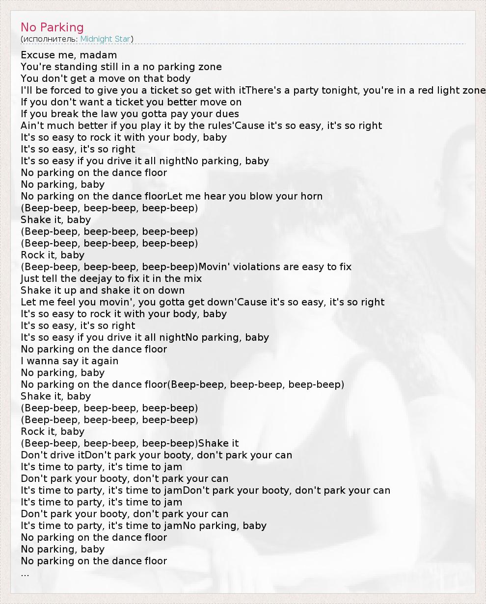 Excuse me, madam You're standing still in a no parking zone You don't get a move on that body I'll be forced to give you a ticket so get with itThere's a party tonight, you're in a red light zone If you don't want a ticket you better move on If you break the law you gotta pay your dues Ain't much better if you play it by the rules'Cause it's so easy, it's so right It's so easy to rock it with your body, baby It's so easy, it's so right It's so easy if you drive it all nightNo parking, baby No parking on the dance floor No parking, baby No parking on the dance floorLet me hear you blow your horn (Beep-beep, beep-beep, beep-beep) Shake it, baby (Beep-beep, beep-beep, beep-beep) (Beep-beep, beep-beep, beep-beep) Rock it, baby (Beep-beep, beep-beep, beep-beep)Movin' violations are easy to fix Just tell the deejay to fix it in the mix Shake it up and shake it on down Let me feel you movin', you gotta get down'Cause it's so easy, it's so right It's so easy to rock it with your body, baby It's so easy, it's so right It's so easy if you drive it all nightNo parking, baby No parking on the dance floor I wanna say it again No parking, baby No parking on the dance floor(Beep-beep, beep-beep, beep-beep) Shake it, baby (Beep-beep, beep-beep, beep-beep) (Beep-beep, beep-beep, beep-beep) Rock it, baby (Beep-beep, beep-beep, beep-beep)Shake it Don't drive itDon't park your booty, don't park your can It's time to party, it's time to jam Don't park your booty, don't park your can It's time to party, it's time to jamDon't park your booty, don't park your can It's time to party, it's time to jam Don't park your booty, don't park your can It's time to party, it's time to jamNo parking, baby No parking on the dance floor No parking, baby No parking on the dance floor ...