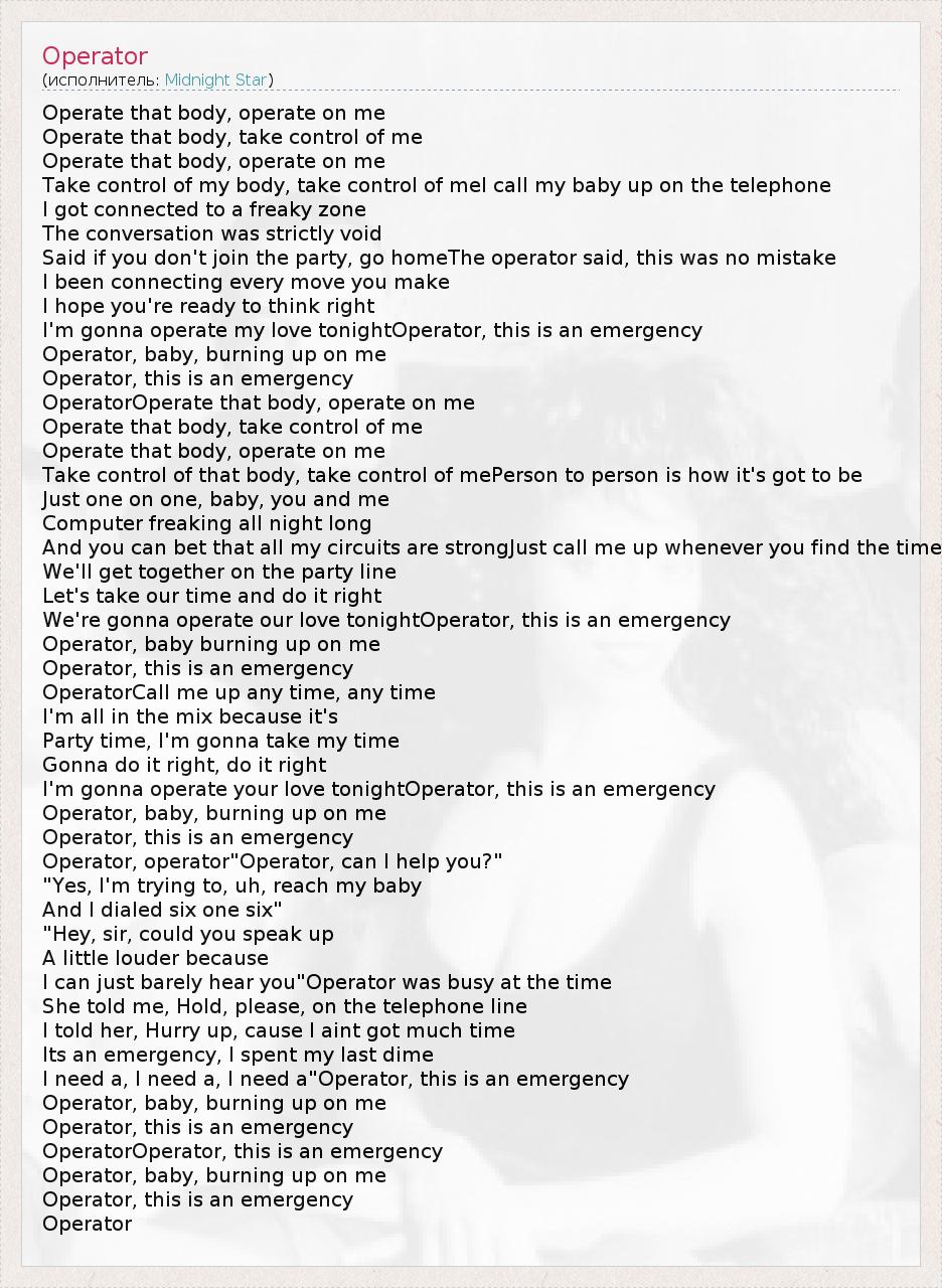 Operate that body, operate on me Operate that body, take control of me Operate that body, operate on me Take control of my body, take control of meI call my baby up on the telephone I got connected to a freaky zone The conversation was strictly void Said if you don't join the party, go homeThe operator said, this was no mistake I been connecting every move you make I hope you're ready to think right I'm gonna operate my love tonightOperator, this is an emergency Operator, baby, burning up on me Operator, this is an emergency OperatorOperate that body, operate on me Operate that body, take control of me Operate that body, operate on me Take control of that body, take control of mePerson to person is how it's got to be Just one on one, baby, you and me Computer freaking all night long And you can bet that all my circuits are strongJust call me up whenever you find the time We'll get together on the party line Let's take our time and do it right We're gonna operate our love tonightOperator, this is an emergency Operator, baby burning up on me Operator, this is an emergency OperatorCall me up any time, any time I'm all in the mix because it's Party time, I'm gonna take my time Gonna do it right, do it right I'm gonna operate your love tonightOperator, this is an emergency Operator, baby, burning up on me Operator, this is an emergency Operator, operator"Operator, can I help you?" "Yes, I'm trying to, uh, reach my baby And I dialed six one six" "Hey, sir, could you speak up A little louder because I can just barely hear you"Operator was busy at the time She told me, Hold, please, on the telephone line I told her, Hurry up, cause I aint got much time Its an emergency, I spent my last dime I need a, I need a, I need a"Operator, this is an emergency Operator, baby, burning up on me Operator, this is an emergency OperatorOperator, this is an emergency Operator, baby, burning up on me Operator, this is an emergency Operator