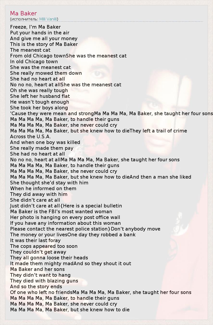 Ma Ma Ma Ma, Ma Baker, but she knew how to dieThey left a trail of crime