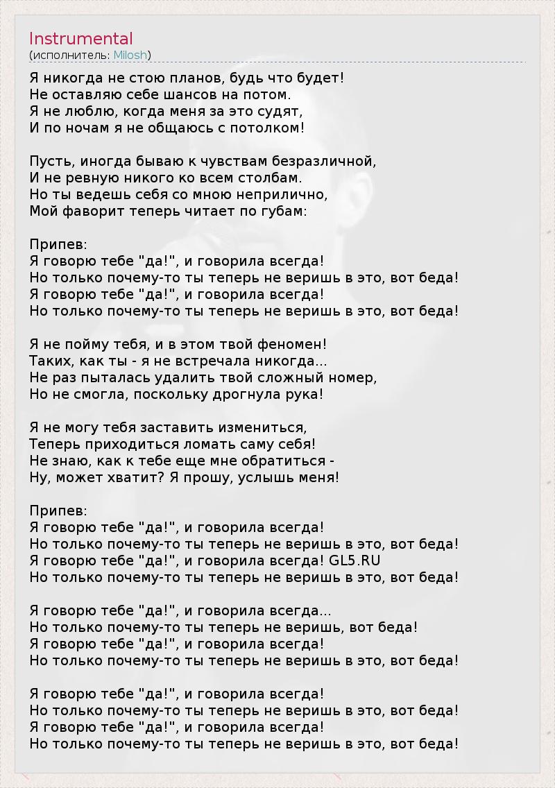 Я никогда не стою планов, будь что будет! Не оставляю себе шансов на потом. Я не люблю, когда меня за это судят, И по ночам я не общаюсь с потолком! Пусть, иногда бываю к чувствам безразличной, И не ревную никого ко всем столбам. Но ты ведешь себя со мною неприлично, Мой фаворит теперь читает по губам: Припев: Я говорю тебе "да!", и говорила всегда! Но только почему-то ты теперь не веришь в это, вот беда! Я говорю тебе "да!", и говорила всегда! Но только почему-то ты теперь не веришь в это, вот беда! Я не пойму тебя, и в этом твой феномен! Таких, как ты - я не встречала никогда... Не раз пыталась удалить твой сложный номер, Но не смогла, поскольку дрогнула рука! Я не могу тебя заставить измениться, Теперь приходиться ломать саму себя! Не знаю, как к тебе еще мне обратиться - Ну, может хватит? Я прошу, услышь меня! Припев: Я говорю тебе "да!", и говорила всегда! Но только почему-то ты теперь не веришь в это, вот беда! Я говорю тебе "да!", и говорила всегда! GL5.RU Но только почему-то ты теперь не веришь в это, вот беда! Я говорю тебе "да!", и говорила всегда... Но только почему-то ты теперь не веришь, вот беда! Я говорю тебе "да!", и говорила всегда! Но только почему-то ты теперь не веришь в это, вот беда! Я говорю тебе "да!", и говорила всегда! Но только почему-то ты теперь не веришь в это, вот беда! Я говорю тебе "да!", и говорила всегда! Но только почему-то ты теперь не веришь в это, вот беда!