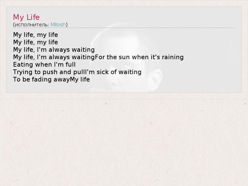 My life, my life My life, my life My life, I'm always waiting My life, I'm always waitingFor the sun when it's raining Eating when I'm full Trying to push and pullI'm sick of waiting To be fading awayMy life