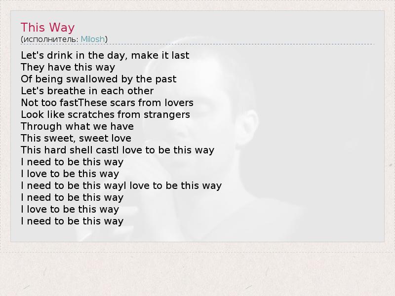 Let's drink in the day, make it last They have this way Of being swallowed by the past Let's breathe in each other Not too fastThese scars from lovers Look like scratches from strangers Through what we have This sweet, sweet love This hard shell castI love to be this way I need to be this way I love to be this way I need to be this wayI love to be this way I need to be this way I love to be this way I need to be this way