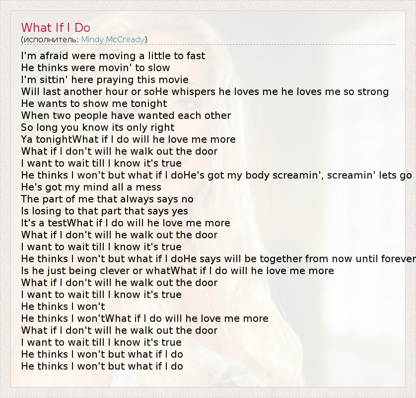 I'm afraid were moving a little to fast He thinks were movin' to slow I'm sittin' here praying this movie Will last another hour or soHe whispers he loves me he loves me so strong He wants to show me tonight When two people have wanted each other So long you know its only right Ya tonightWhat if I do will he love me more What if I don't will he walk out the door I want to wait till I know it's true He thinks I won't but what if I doHe's got my body screamin', screamin' lets go He's got my mind all a mess The part of me that always says no Is losing to that part that says yes It's a testWhat if I do will he love me more What if I don't will he walk out the door I want to wait till I know it's true He thinks I won't but what if I doHe says will be together from now until forever Is he just being clever or whatWhat if I do will he love me more What if I don't will he walk out the door I want to wait till I know it's true He thinks I won't He thinks I won'tWhat if I do will he love me more What if I don't will he walk out the door I want to wait till I know it's true He thinks I won't but what if I do He thinks I won't but what if I do