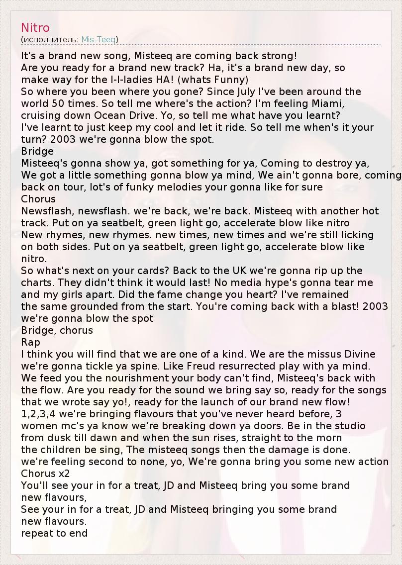 It's a brand new song, Misteeq are coming back strong! Are you ready for a brand new track? Ha, it's a brand new day, so make way for the l-l-ladies HA! (whats Funny) So where you been where you gone? Since July I've been around the world 50 times. So tell me where's the action? I'm feeling Miami, cruising down Ocean Drive. Yo, so tell me what have you learnt? I've learnt to just keep my cool and let it ride. So tell me when's it your turn? 2003 we're gonna blow the spot. Bridge Misteeq's gonna show ya, got something for ya, Coming to destroy ya, We got a little something gonna blow ya mind, We ain't gonna bore, coming back on tour, lot's of funky melodies your gonna like for sure Chorus Newsflash, newsflash. we're back, we're back. Misteeq with another hot track. Put on ya seatbelt, green light go, accelerate blow like nitro New rhymes, new rhymes. new times, new times and we're still licking on both sides. Put on ya seatbelt, green light go, accelerate blow like nitro. So what's next on your cards? Back to the UK we're gonna rip up the charts. They didn't think it would last! No media hype's gonna tear me and my girls apart. Did the fame change you heart? I've remained the same grounded from the start. You're coming back with a blast! 2003 we're gonna blow the spot Bridge, chorus Rap I think you will find that we are one of a kind. We are the missus Divine we're gonna tickle ya spine. Like Freud resurrected play with ya mind. We feed you the nourishment your body can't find, Misteeq's back with the flow. Are you ready for the sound we bring say so, ready for the songs that we wrote say yo!, ready for the launch of our brand new flow! 1,2,3,4 we're bringing flavours that you've never heard before, 3 women mc's ya know we're breaking down ya doors. Be in the studio from dusk till dawn and when the sun rises, straight to the morn the children be sing, The misteeq songs then the damage is done. we're feeling second to none, yo, We're gonna bring you some new action Chorus x2 You'll see your in for a treat, JD and Misteeq bring you some brand new flavours, See your in for a treat, JD and Misteeq bringing you some brand new flavours. repeat to end