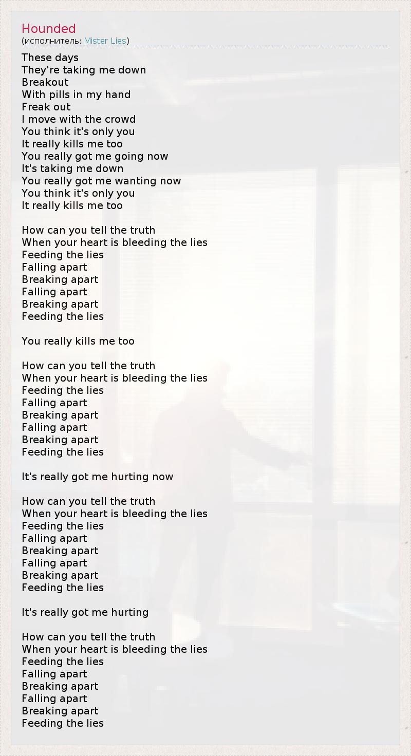 These days They're taking me down Breakout With pills in my hand Freak out I move with the crowd You think it's only you It really kills me too You really got me going now It's taking me down You really got me wanting now You think it's only you It really kills me too How can you tell the truth When your heart is bleeding the lies Feeding the lies Falling apart Breaking apart Falling apart Breaking apart Feeding the lies You really kills me too How can you tell the truth When your heart is bleeding the lies Feeding the lies Falling apart Breaking apart Falling apart Breaking apart Feeding the lies It's really got me hurting now How can you tell the truth When your heart is bleeding the lies Feeding the lies Falling apart Breaking apart Falling apart Breaking apart Feeding the lies It's really got me hurting How can you tell the truth When your heart is bleeding the lies Feeding the lies Falling apart Breaking apart Falling apart Breaking apart Feeding the lies