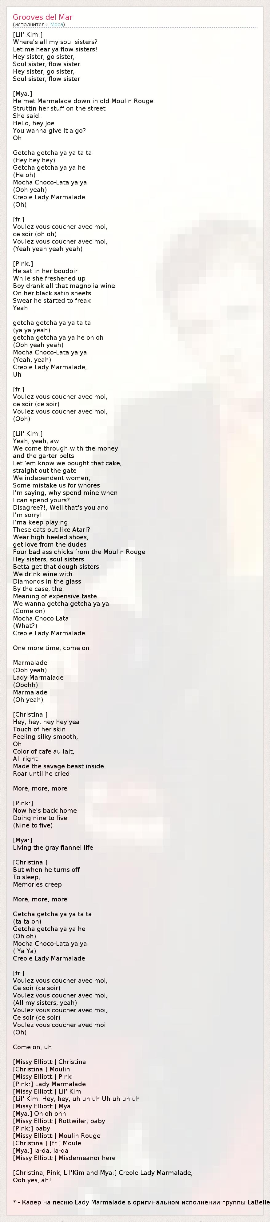 [Lil' Kim:] Where's all my soul sisters? Let me hear ya flow sisters! Hey sister, go sister, Soul sister, flow sister. Hey sister, go sister, Soul sister, flow sister [Mya:] He met Marmalade down in old Moulin Rouge Struttin her stuff on the street She said: Hello, hey Joe You wanna give it a go? Oh Getcha getcha ya ya ta ta (Hey hey hey) Getcha getcha ya ya he (He oh) Mocha Choco-Lata ya ya (Ooh yeah) Creole Lady Marmalade (Oh) [fr.] Voulez vous coucher avec moi, ce soir (oh oh) Voulez vous coucher avec moi, (Yeah yeah yeah yeah) [Pink:] He sat in her boudoir While she freshened up Boy drank all that magnolia wine On her black satin sheets Swear he started to freak Yeah getcha getcha ya ya ta ta (ya ya yeah) getcha getcha ya ya he oh oh (Ooh yeah yeah) Mocha Choco-Lata ya ya (Yeah, yeah) Creole Lady Marmalade, Uh [fr.] Voulez vous coucher avec moi, ce soir (ce soir) Voulez vous coucher avec moi, (Ooh) [Lil' Kim:] Yeah, yeah, aw We come through with the money and the garter belts Let ‘em know we bought that cake, straight out the gate We independent women, Some mistake us for whores I'm saying, why spend mine when I can spend yours? Disagree?!, Well that's you and I'm sorry! I'ma keep playing These cats out like Atari? Wear high heeled shoes, get love from the dudes Four bad ass chicks from the Moulin Rouge Hey sisters, soul sisters Betta get that dough sisters We drink wine with Diamonds in the glass By the case, the Meaning of expensive taste We wanna getcha getcha ya ya (Come on) Mocha Choco Lata (What?) Creole Lady Marmalade One more time, come on Marmalade (Ooh yeah) Lady Marmalade (Ooohh) Marmalade (Oh yeah) [Christina:] Hey, hey, hey hey yea Touch of her skin Feeling silky smooth, Oh Color of cafe au lait, All right Made the savage beast inside Roar until he cried More, more, more [Pink:] Now he's back home Doing nine to five (Nine to five) [Mya:] Living the gray flannel life [Christina:] But when he turns off To sleep, Memories creep More, more, more Getcha getcha ya ya ta ta (ta ta oh) Getcha getcha ya ya he (Oh oh) Mocha Choco-Lata ya ya ( Ya Ya) Creole Lady Marmalade [fr.] Voulez vous coucher avec moi, Ce soir (ce soir) Voulez vous coucher avec moi, (All my sisters, yeah) Voulez vous coucher avec moi, Ce soir (ce soir) Voulez vous coucher avec moi (Oh) Come on, uh [Missy Elliott:] Christina [Christina:] Moulin [Missy Elliott:] Pink [Pink:] Lady Marmalade [Missy Elliott:] Lil' Kim [Lil' Kim: Hey, hey, uh uh uh Uh uh uh uh [Missy Elliott:] Mya [Mya:] Oh oh ohh [Missy Elliott:] Rottwiler, baby [Pink:] baby [Missy Elliott:] Moulin Rouge [Christina:] [fr.] Moule [Mya:] la-da, la-da [Missy Elliott:] Misdemeanor here [Christina, Pink, Lil'Kim and Mya:] Creole Lady Marmalade, Ooh yes, ah! * - Кавер на песню Lady Marmalade в оригинальном исполнении группы LaBelle