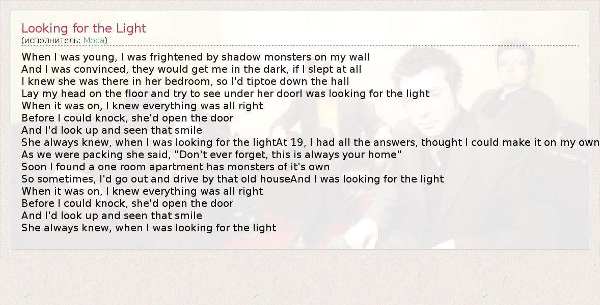 When I was young, I was frightened by shadow monsters on my wall And I was convinced, they would get me in the dark, if I slept at all I knew she was there in her bedroom, so I'd tiptoe down the hall Lay my head on the floor and try to see under her doorI was looking for the light When it was on, I knew everything was all right Before I could knock, she'd open the door And I'd look up and seen that smile She always knew, when I was looking for the lightAt 19, I had all the answers, thought I could make it on my own As we were packing she said, "Don't ever forget, this is always your home" Soon I found a one room apartment has monsters of it's own So sometimes, I'd go out and drive by that old houseAnd I was looking for the light When it was on, I knew everything was all right Before I could knock, she'd open the door And I'd look up and seen that smile She always knew, when I was looking for the light
