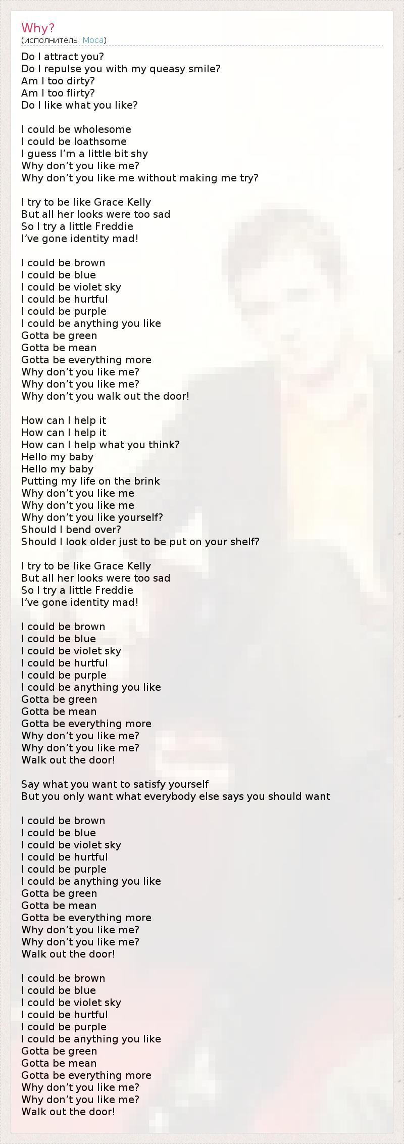 Я привлекателен для тебя? Или тебя тошнит от моей улыбки? Я неприлично веду себя? Тебе не нравится, как я заигрываю с тобой? У нас схожие предпочтения? Я могу быть приятным, А могу быть противным. Думаю, я немного застенчив. Почему я тебе не нравлюсь? Почему ты отвергаешь меня, даже не дав мне шанса? Я стараюсь походить на Грейс Келли, Но она выглядит такой печальной! Поэтому лучше я примерю на себя имидж Фредди. Кажется, у меня кризис идентичности, а может, крыша поехала… Я могу быть коричневым, Я могу быть голубым, Я могу быть фиолетовым небом. Я могу причинять боль, Я могу быть очень важным, Я могу быть тем, кем ты захочешь меня видеть. Я должен быть более энергичным, Я должен быть более ярким, Я должен стать на порядок лучше во всём. Почему я тебе не нравлюсь? Почему я тебе не нравлюсь? Почему бы тебе не выйти отсюда! Как мне понять, Как мне понять, Как мне понять твоё отношение? Привет, детка! Привет, детка! Я хожу по краю пропасти. Почему я тебе не нравлюсь? Почему я тебе не нравлюсь? Почему ты не любишь себя? Я должен прогнуться? Я должен выглядеть старше, чтобы ты обратила на меня внимание? Я стараюсь походить на Грейс Келли, Но она выглядит такой печальной! Поэтому лучше я примерю на себя имидж Фредди. Кажется, у меня кризис идентичности, а может, крыша поехала… Я могу быть коричневым, Я могу быть голубым, Я могу быть фиолетовым небом. Я могу причинять боль, Я могу быть очень важным, Я могу быть тем, кем ты захочешь меня видеть. Я должен быть более энергичным, Я должен быть более ярким, Я должен стать на порядок лучше во всём. Почему я тебе не нравлюсь? Почему я тебе не нравлюсь? Почему бы тебе не выйти отсюда! Говори, что хочешь для самоуспокоения, Но, на самом деле, ты хочешь того, чего, по мнению других, тебе следует хотеть… Я могу быть коричневым, Я могу быть голубым, Я могу быть фиолетовым небом. Я могу причинять боль, Я могу быть очень важным, Я могу быть тем, кем ты захочешь меня видеть. Я должен быть более энергичным, Я должен быть более ярким, Я должен стать на порядок лучше во всём. Почему я тебе не нравлюсь? Почему я тебе не нравлюсь? Почему бы тебе не выйти отсюда! Я могу быть коричневым, Я могу быть голубым, Я могу быть фиолетовым небом. Я могу причинять боль, Я могу быть очень важным, Я могу быть тем, кем ты захочешь меня видеть. Я должен быть более энергичным, Я должен быть более ярким, Я должен стать на порядок лучше во всём. Почему я тебе не нравлюсь? Почему я тебе не нравлюсь? Почему бы тебе не выйти отсюда!
