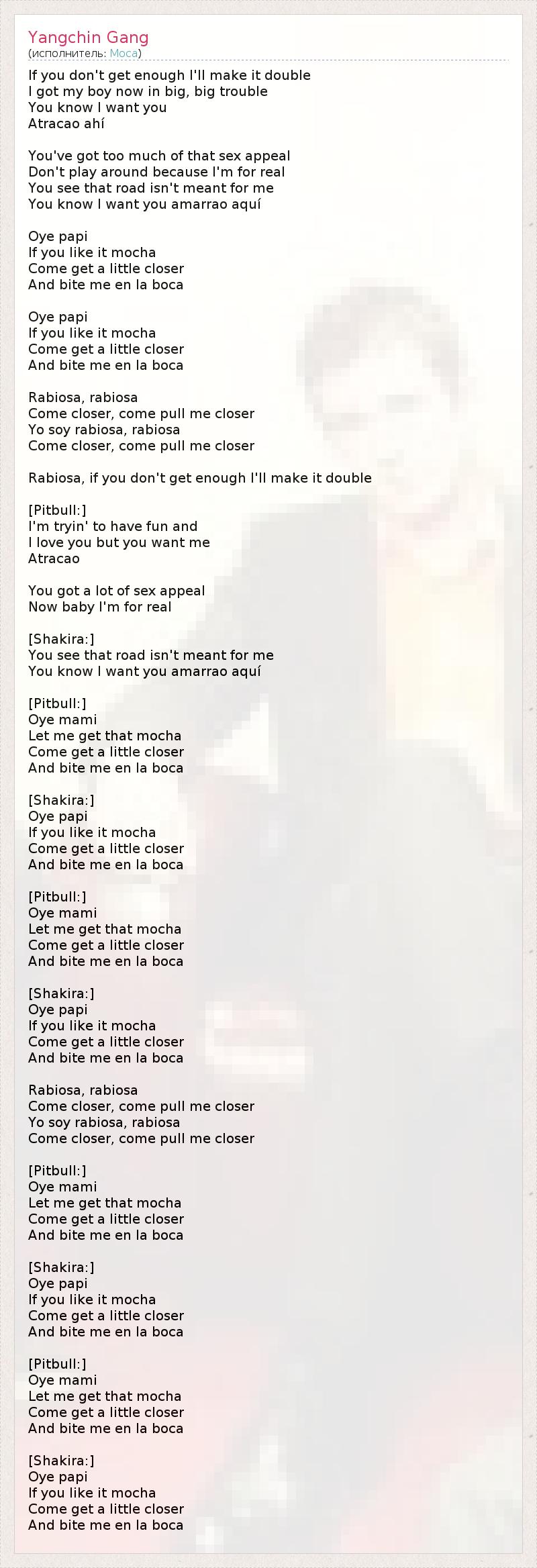 If you don't get enough I'll make it double I got my boy now in big, big trouble You know I want you Atracao ahí You've got too much of that sex appeal Don't play around because I'm for real You see that road isn't meant for me You know I want you amarrao aquí Oye papi If you like it mocha Come get a little closer And bite me en la boca Oye papi If you like it mocha Come get a little closer And bite me en la boca Rabiosa, rabiosa Come closer, come pull me closer Yo soy rabiosa, rabiosa Come closer, come pull me closer Rabiosa, if you don't get enough I'll make it double [Pitbull:] I'm tryin' to have fun and I love you but you want me Atracao You got a lot of sex appeal Now baby I'm for real [Shakira:] You see that road isn't meant for me You know I want you amarrao aquí [Pitbull:] Oye mami Let me get that mocha Come get a little closer And bite me en la boca [Shakira:] Oye papi If you like it mocha Come get a little closer And bite me en la boca [Pitbull:] Oye mami Let me get that mocha Come get a little closer And bite me en la boca [Shakira:] Oye papi If you like it mocha Come get a little closer And bite me en la boca Rabiosa, rabiosa Come closer, come pull me closer Yo soy rabiosa, rabiosa Come closer, come pull me closer [Pitbull:] Oye mami Let me get that mocha Come get a little closer And bite me en la boca [Shakira:] Oye papi If you like it mocha Come get a little closer And bite me en la boca [Pitbull:] Oye mami Let me get that mocha Come get a little closer And bite me en la boca [Shakira:] Oye papi If you like it mocha Come get a little closer And bite me en la boca