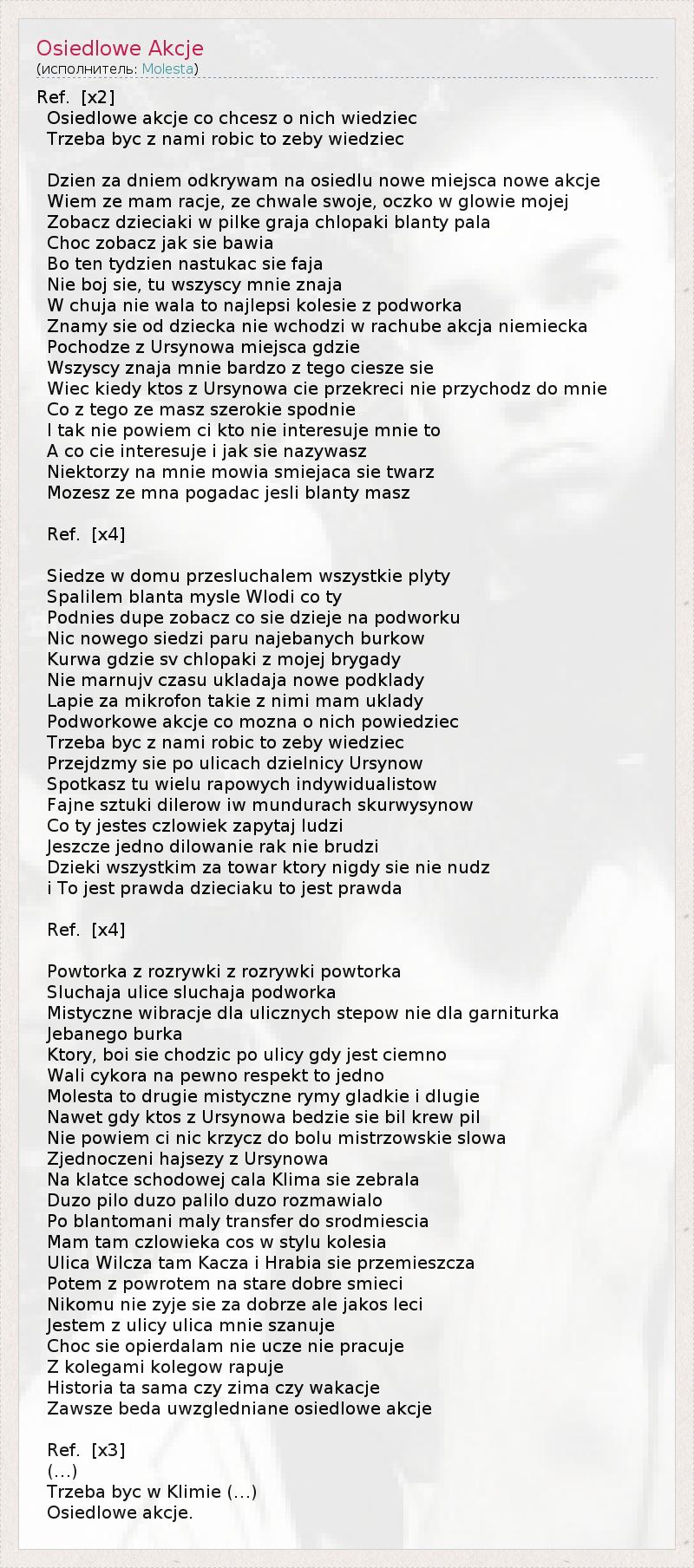 Ref. [x2] Osiedlowe akcje co chcesz o nich wiedziec Trzeba byc z nami robic to zeby wiedziec Dzien za dniem odkrywam na osiedlu nowe miejsca nowe akcje Wiem ze mam racje, ze chwale swoje, oczko w glowie mojej Zobacz dzieciaki w pilke graja chlopaki blanty pala Choc zobacz jak sie bawia Bo ten tydzien nastukac sie faja Nie boj sie, tu wszyscy mnie znaja W chuja nie wala to najlepsi kolesie z podworka Znamy sie od dziecka nie wchodzi w rachube akcja niemiecka Pochodze z Ursynowa miejsca gdzie Wszyscy znaja mnie bardzo z tego ciesze sie Wiec kiedy ktos z Ursynowa cie przekreci nie przychodz do mnie Co z tego ze masz szerokie spodnie I tak nie powiem ci kto nie interesuje mnie to A co cie interesuje i jak sie nazywasz Niektorzy na mnie mowia smiejaca sie twarz Mozesz ze mna pogadac jesli blanty masz Ref. [x4] Siedze w domu przesluchalem wszystkie plyty Spalilem blanta mysle Wlodi co ty Podnies dupe zobacz co sie dzieje na podworku Nic nowego siedzi paru najebanych burkow Kurwa gdzie sv chlopaki z mojej brygady Nie marnujv czasu ukladaja nowe podklady Lapie za mikrofon takie z nimi mam uklady Podworkowe akcje co mozna o nich powiedziec Trzeba byc z nami robic to zeby wiedziec Przejdzmy sie po ulicach dzielnicy Ursynow Spotkasz tu wielu rapowych indywidualistow Fajne sztuki dilerow iw mundurach skurwysynow Co ty jestes czlowiek zapytaj ludzi Jeszcze jedno dilowanie rak nie brudzi Dzieki wszystkim za towar ktory nigdy sie nie nudz i To jest prawda dzieciaku to jest prawda Ref. [x4] Powtorka z rozrywki z rozrywki powtorka Sluchaja ulice sluchaja podworka Mistyczne wibracje dla ulicznych stepow nie dla garniturka Jebanego burka Ktory, boi sie chodzic po ulicy gdy jest ciemno Wali cykora na pewno respekt to jedno Molesta to drugie mistyczne rymy gladkie i dlugie Nawet gdy ktos z Ursynowa bedzie sie bil krew pil Nie powiem ci nic krzycz do bolu mistrzowskie slowa Zjednoczeni hajsezy z Ursynowa Na klatce schodowej cala Klima sie zebrala Duzo pilo duzo palilo duzo rozmawialo Po blantomani maly transfer do srodmiescia Mam tam czlowieka cos w stylu kolesia Ulica Wilcza tam Kacza i Hrabia sie przemieszcza Potem z powrotem na stare dobre smieci Nikomu nie zyje sie za dobrze ale jakos leci Jestem z ulicy ulica mnie szanuje Choc sie opierdalam nie ucze nie pracuje Z kolegami kolegow rapuje Historia ta sama czy zima czy wakacje Zawsze beda uwzgledniane osiedlowe akcje Ref. [x3] (…) Trzeba byc w Klimie (…) Osiedlowe akcje.