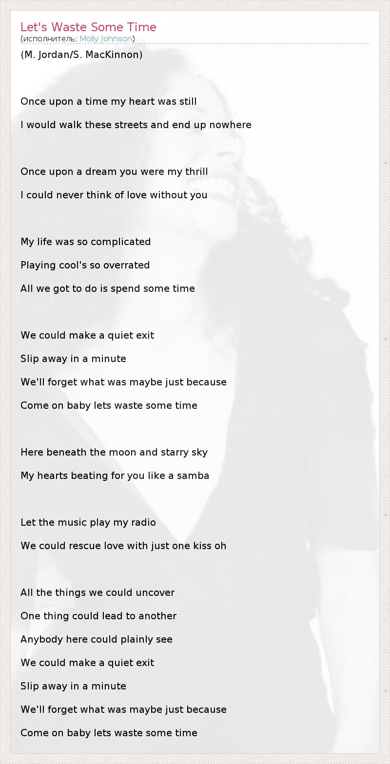 (M. Jordan/S. MacKinnon) Once upon a time my heart was still I would walk these streets and end up nowhere Once upon a dream you were my thrill I could never think of love without you My life was so complicated Playing cool's so overrated All we got to do is spend some time We could make a quiet exit Slip away in a minute We'll forget what was maybe just because Come on baby lets waste some time Here beneath the moon and starry sky My hearts beating for you like a samba Let the music play my radio We could rescue love with just one kiss oh All the things we could uncover One thing could lead to another Anybody here could plainly see We could make a quiet exit Slip away in a minute We'll forget what was maybe just because Come on baby lets waste some time