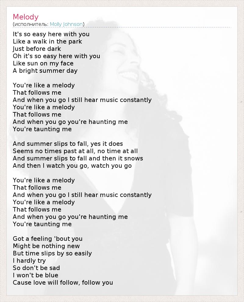 Ведь это так просто с тобой Как прогулка в парке Просто до темноты О, это так легко с тобой Как солнце на моем лице Яркий летний день Ты как мелодии Это следует за мной И когда вы идете, я до сих пор слышу музыку постоянно Ты как мелодии Это следует за мной И когда вы идете вы преследует меня Ты дразнил меня И летом скользит падать, да это делает Кажется, нет раз мимо вообще , нет времени на все И летом скользит падать , а затем идет снег А потом я смотрю вы идете , смотреть вы идете Ты как мелодии Это следует за мной И когда вы идете, я до сих пор слышу музыку постоянно Ты как мелодии Это следует за мной И когда вы идете вы преследует меня Ты дразнил меня Получил чувство насчет тебя Может быть ничего нового Но время скользит по так легко Я вряд ли попробовать Так не грусти Я не буду синий Потому что любовь будет следовать , следовать за вами