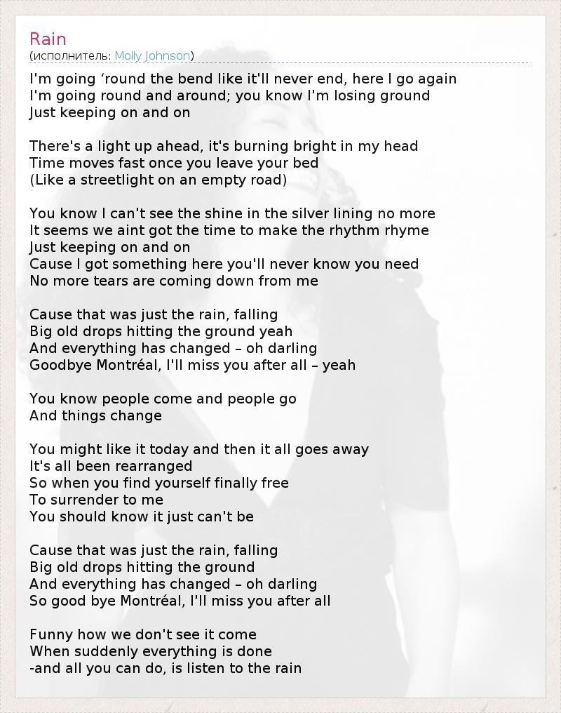 I'm going ‘round the bend like it'll never end, here I go again I'm going round and around; you know I'm losing ground Just keeping on and on There's a light up ahead, it's burning bright in my head Time moves fast once you leave your bed (Like a streetlight on an empty road) You know I can't see the shine in the silver lining no more It seems we aint got the time to make the rhythm rhyme Just keeping on and on Cause I got something here you'll never know you need No more tears are coming down from me Cause that was just the rain, falling Big old drops hitting the ground yeah And everything has changed – oh darling Goodbye Montréal, I'll miss you after all – yeah You know people come and people go And things change You might like it today and then it all goes away It's all been rearranged So when you find yourself finally free To surrender to me You should know it just can't be Cause that was just the rain, falling Big old drops hitting the ground And everything has changed – oh darling So good bye Montréal, I'll miss you after all Funny how we don't see it come When suddenly everything is done -and all you can do, is listen to the rain