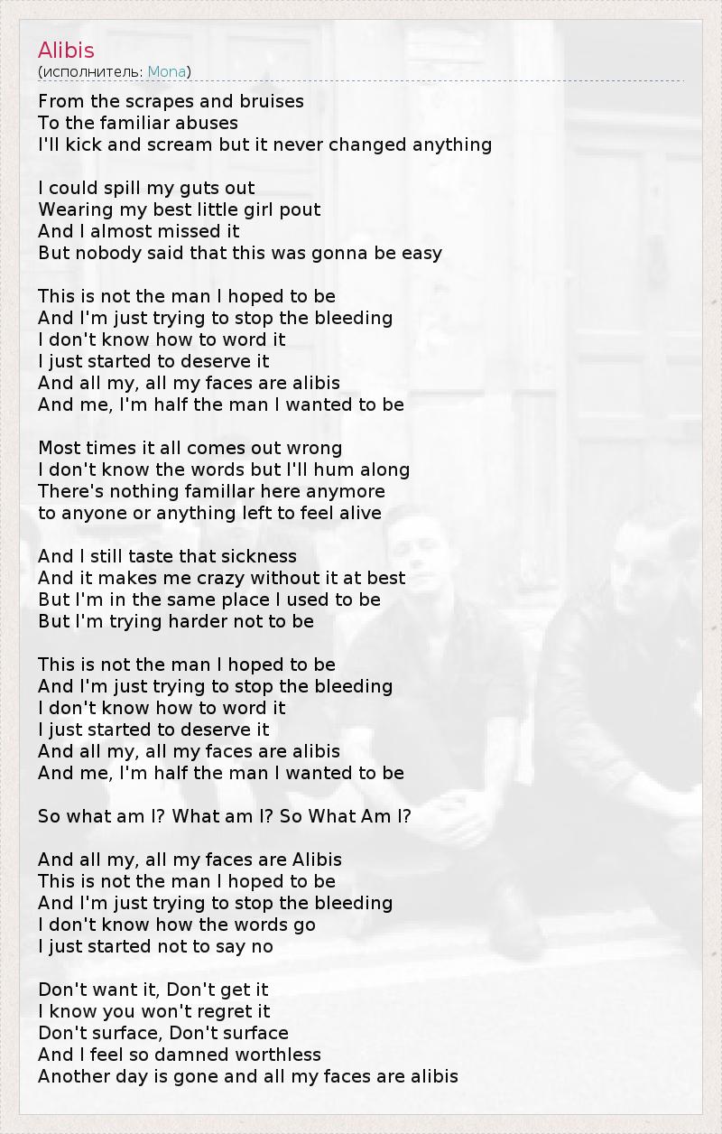 From the scrapes and bruises To the familiar abuses I'll kick and scream but it never changed anything I could spill my guts out Wearing my best little girl pout And I almost missed it But nobody said that this was gonna be easy This is not the man I hoped to be And I'm just trying to stop the bleeding I don't know how to word it I just started to deserve it And all my, all my faces are alibis And me, I'm half the man I wanted to be Most times it all comes out wrong I don't know the words but I'll hum along There's nothing famillar here anymore to anyone or anything left to feel alive And I still taste that sickness And it makes me crazy without it at best But I'm in the same place I used to be But I'm trying harder not to be This is not the man I hoped to be And I'm just trying to stop the bleeding I don't know how to word it I just started to deserve it And all my, all my faces are alibis And me, I'm half the man I wanted to be So what am I? What am I? So What Am I? And all my, all my faces are Alibis This is not the man I hoped to be And I'm just trying to stop the bleeding I don't know how the words go I just started not to say no Don't want it, Don't get it I know you won't regret it Don't surface, Don't surface And I feel so damned worthless Another day is gone and all my faces are alibis