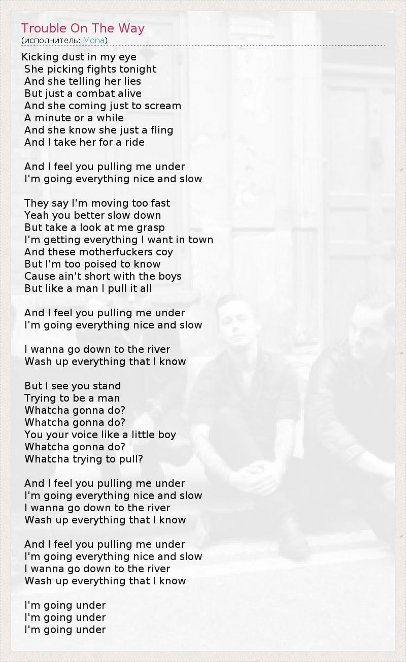 Kicking dust in my eye She picking fights tonight And she telling her lies But just a combat alive And she coming just to scream A minute or a while And she know she just a fling And I take her for a ride And I feel you pulling me under I'm going everything nice and slow They say I'm moving too fast Yeah you better slow down But take a look at me grasp I'm getting everything I want in town And these motherfuckers coy But I'm too poised to know Cause ain't short with the boys But like a man I pull it all And I feel you pulling me under I'm going everything nice and slow I wanna go down to the river Wash up everything that I know But I see you stand Trying to be a man Whatcha gonna do? Whatcha gonna do? You your voice like a little boy Whatcha gonna do? Whatcha trying to pull? And I feel you pulling me under I'm going everything nice and slow I wanna go down to the river Wash up everything that I know And I feel you pulling me under I'm going everything nice and slow I wanna go down to the river Wash up everything that I know I'm going under I'm going under I'm going under
