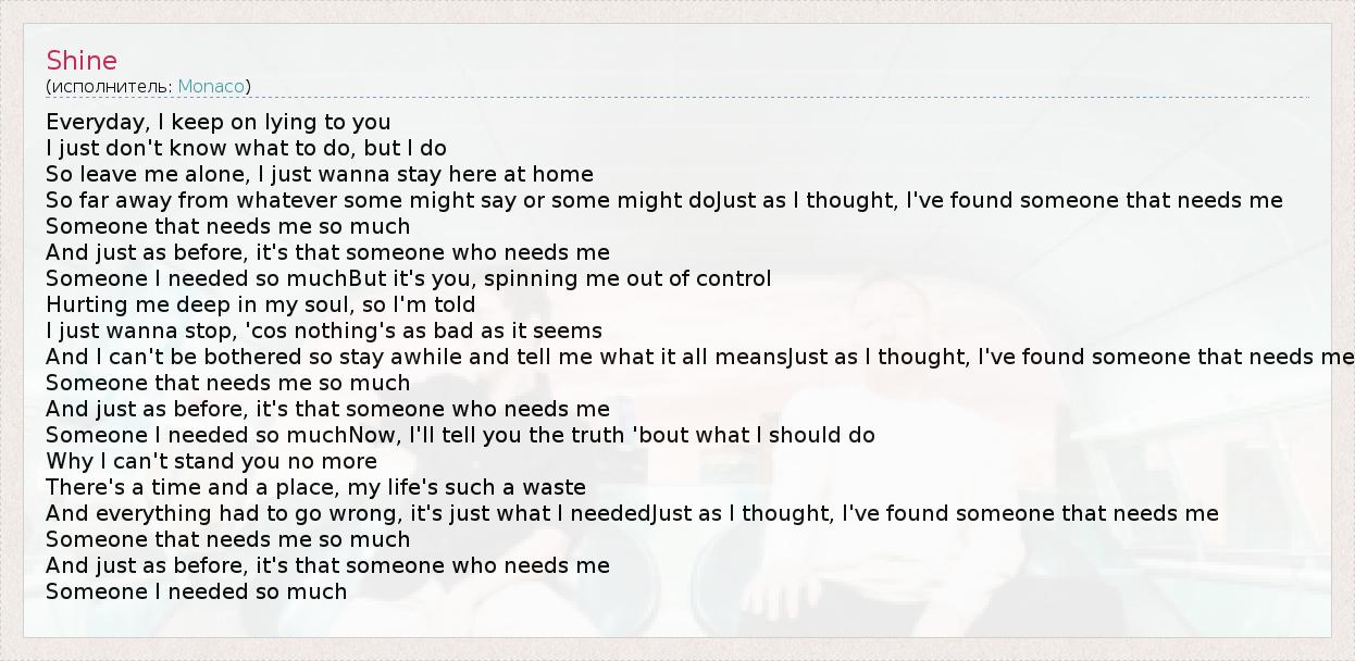 Everyday, I keep on lying to you I just don't know what to do, but I do So leave me alone, I just wanna stay here at home So far away from whatever some might say or some might doJust as I thought, I've found someone that needs me Someone that needs me so much And just as before, it's that someone who needs me Someone I needed so muchBut it's you, spinning me out of control Hurting me deep in my soul, so I'm told I just wanna stop, 'cos nothing's as bad as it seems And I can't be bothered so stay awhile and tell me what it all meansJust as I thought, I've found someone that needs me Someone that needs me so much And just as before, it's that someone who needs me Someone I needed so muchNow, I'll tell you the truth 'bout what I should do Why I can't stand you no more There's a time and a place, my life's such a waste And everything had to go wrong, it's just what I neededJust as I thought, I've found someone that needs me Someone that needs me so much And just as before, it's that someone who needs me Someone I needed so much