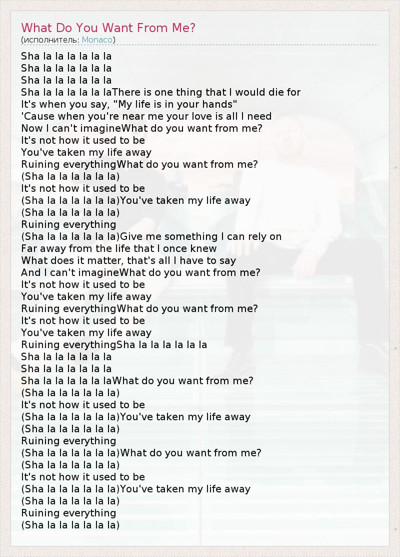 Sha la la la la la la Sha la la la la la la Sha la la la la la la Sha la la la la la laThere is one thing that I would die for It's when you say, "My life is in your hands" 'Cause when you're near me your love is all I need Now I can't imagineWhat do you want from me? It's not how it used to be You've taken my life away Ruining everythingWhat do you want from me? (Sha la la la la la la) It's not how it used to be (Sha la la la la la la)You've taken my life away (Sha la la la la la la) Ruining everything (Sha la la la la la la)Give me something I can rely on Far away from the life that I once knew What does it matter, that's all I have to say And I can't imagineWhat do you want from me? It's not how it used to be You've taken my life away Ruining everythingWhat do you want from me? It's not how it used to be You've taken my life away Ruining everythingSha la la la la la la Sha la la la la la la Sha la la la la la la Sha la la la la la laWhat do you want from me? (Sha la la la la la la) It's not how it used to be (Sha la la la la la la)You've taken my life away (Sha la la la la la la) Ruining everything (Sha la la la la la la)What do you want from me? (Sha la la la la la la) It's not how it used to be (Sha la la la la la la)You've taken my life away (Sha la la la la la la) Ruining everything (Sha la la la la la la)