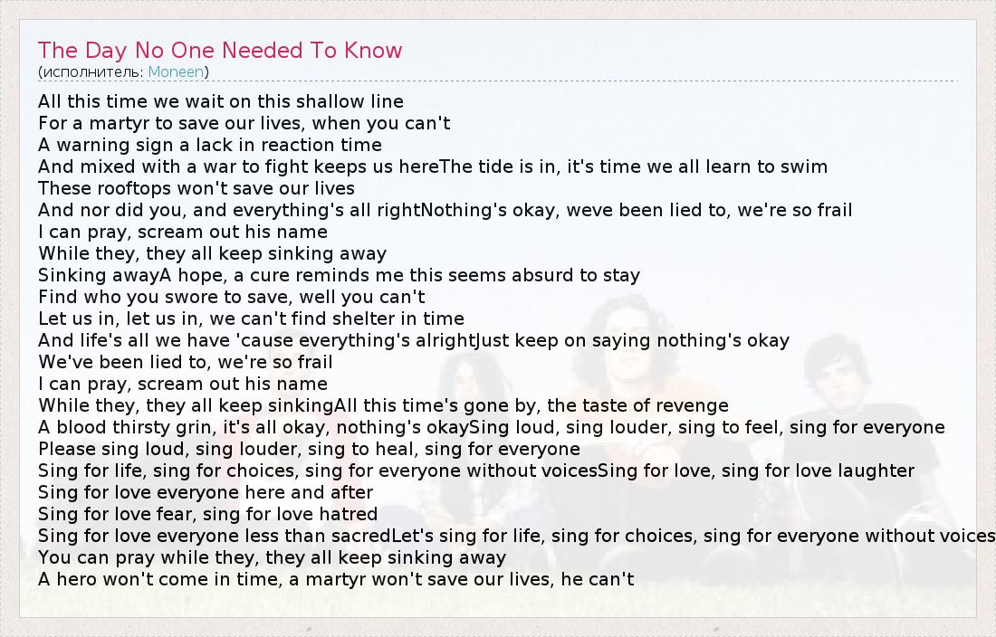 А как ты думаешь, о чем песня "The Day No One Needed To Know" ?